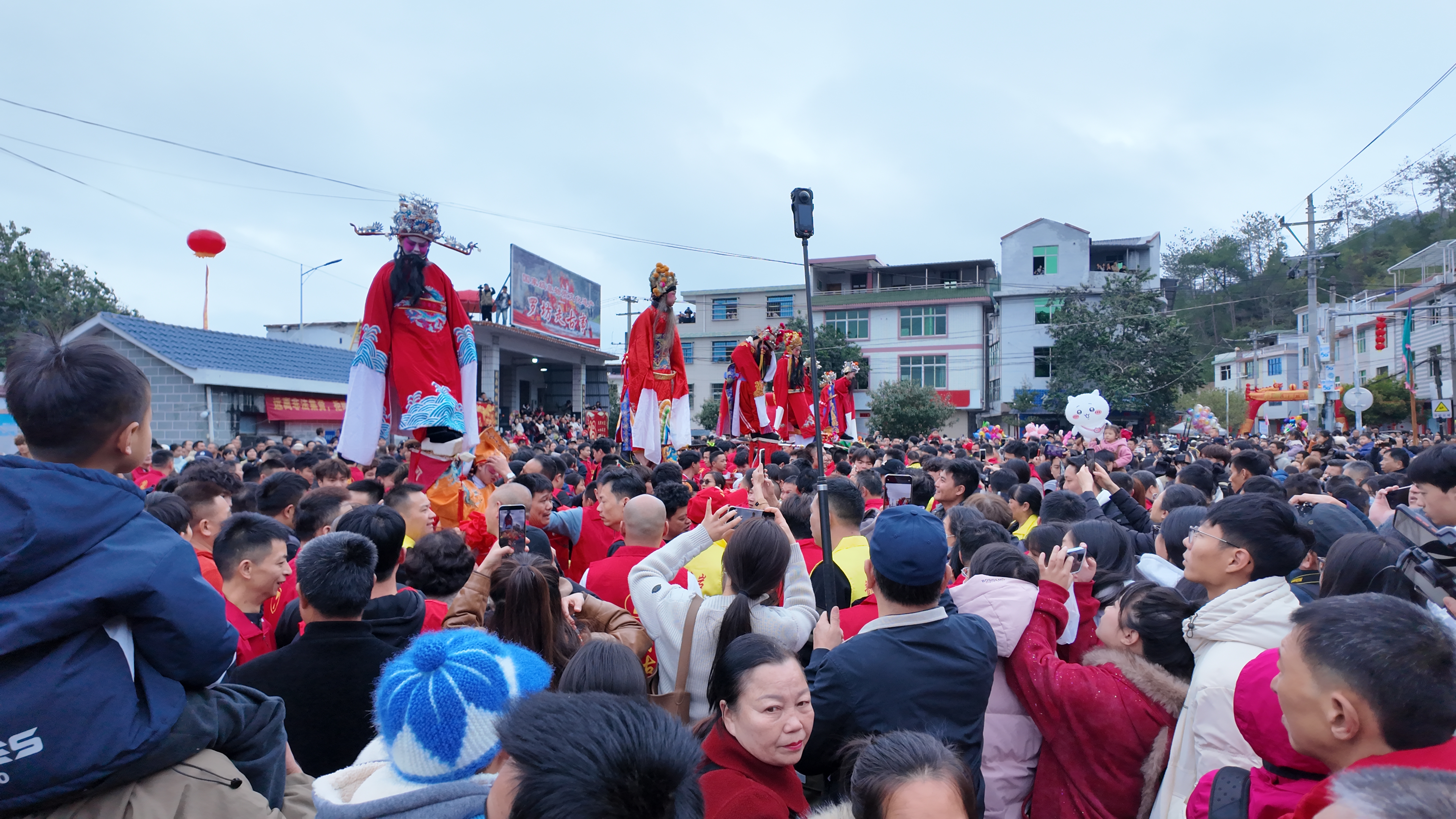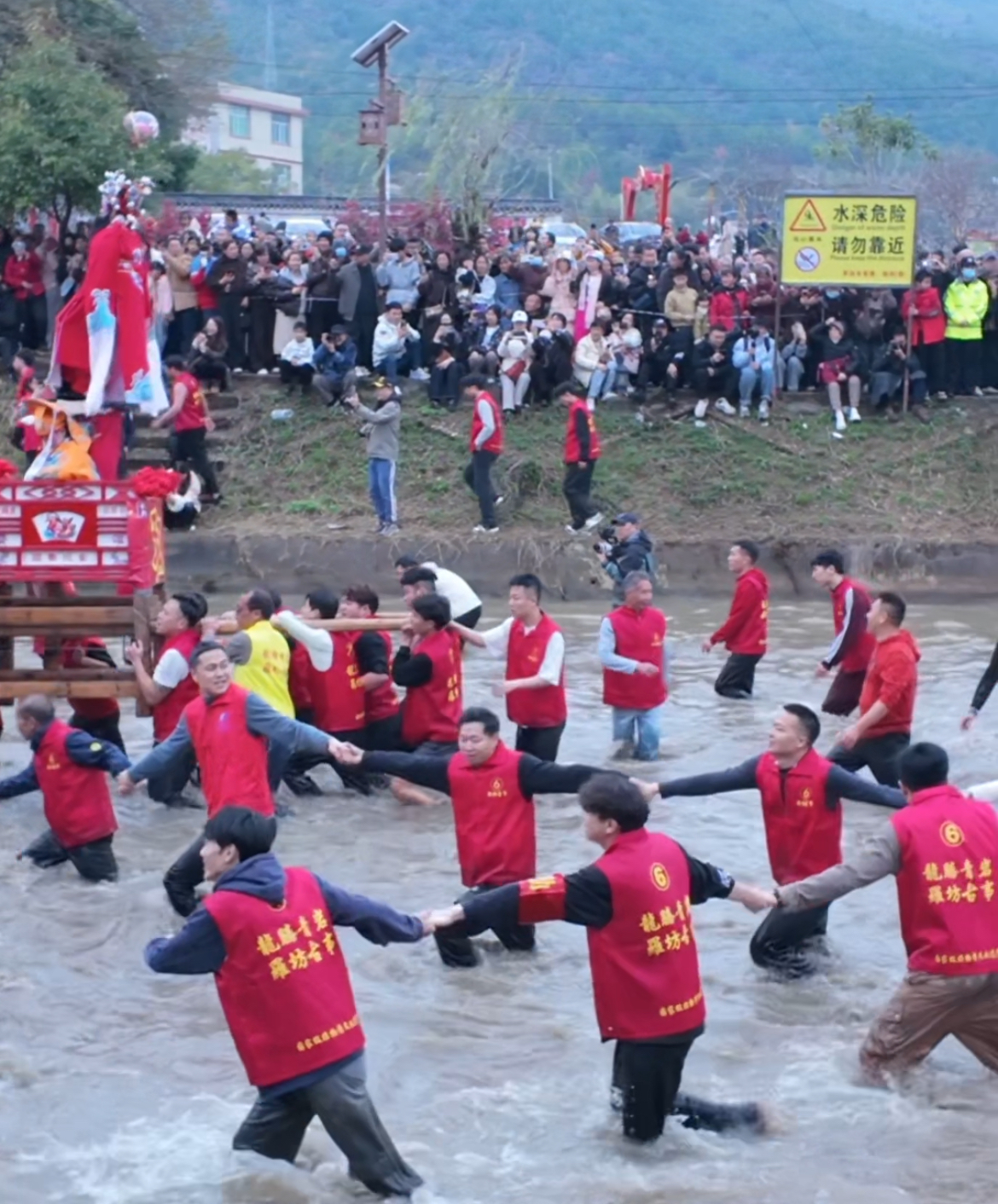 “走古事”是已有三百余年历史的客家元宵盛会,特制轿子搭载两名身穿戏服、脸化油彩扮作经典历史人物的男童,称古事棚,青壮年肩扛“忠、义、仁、智、礼、信、和”七个古事棚陆上疾走、逆水竞速,以此祈愿来年风调雨顺、五谷丰登。锣鼓节奏中呐喊震天,水花四溅而起,古事棚队伍在镇上巡游一圈后终于下水,场面激烈却有序,人们簇拥着自己的古事棚在水里艰难前行,不少人与伙伴携手而行,任河水牵绊,始终步调一致、合力向前。