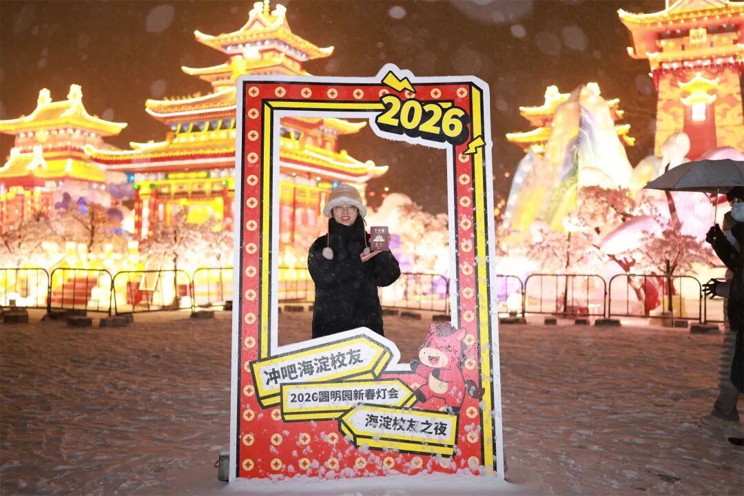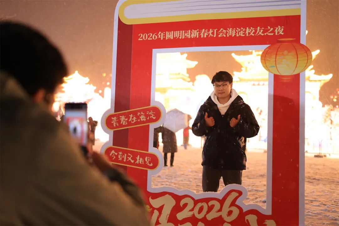 在雪景与花灯相映成趣的圆明园内,校友们漫步于圆明园遗址间,在 “海淀校友打卡点” 定格美好瞬间,在璀璨灯火中感受海淀科技强区的时代脉搏,彼此分享着在海淀的成长故事,诉说着对这片土地的深厚情感。温馨的氛围中,年味与校友情、故乡情交织相融,成为这个夜晚最温暖的底色。