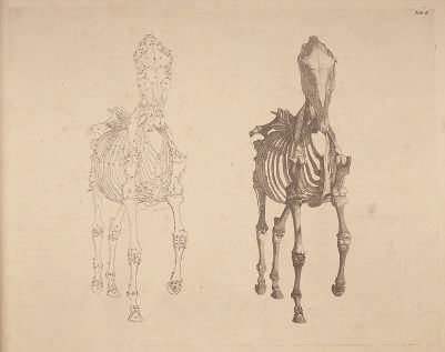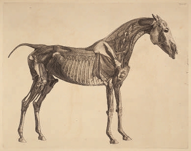 18世纪最著名的艺术家之一乔治·斯塔布斯曾在英国约克郡医院接受了解剖动物和人类尸体的培训。1759年至1761年,他专注于研究马的解剖结构及其身体特征。他花了两年时间专心解剖马匹,忍受着马尸腐烂后散发的恶臭,描绘它们的骨骼、血管和肌肉——终于他完成了《马的解剖学》一书。斯塔布斯先使用铅笔、粉笔或墨水等多种工具,在纸上描绘马的骨骼、心血管系统和肌肉系统,再将终稿转印到铜版上,以制作版画。斯塔布斯一共绘制了3张附有插图的马骨骼的解剖表,15张马的肌肉、筋膜、韧带、神经、动脉、静脉、腺体和软骨的解剖表,每幅插图都从不同角度展示马的躯体,逐层显露其内部结构,就好像皮肤或肌肉在连续的图像中被层层剥离,呈现在读者眼前。《马的解剖学》展现了科学与艺术的交织,这一转变背后,是启蒙时代科学精神的兴起,自然不再仅仅是利用的对象,而是需要系统研究和理性理解的对象,正如斯塔布斯在书中阐释自己进行这项精确研究的理由:希望这本书不仅能引起艺术家的兴趣,还能吸引养马人、蹄铁匠和兽医。