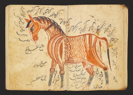 本书中收录的13世纪《兽医书》手稿,被认为是阿拉伯世界最早的系统性马医学文献之一。除了文字说明,手稿中还有两幅关于马的图表,分别标出了马的优点和缺陷;结尾另有两幅“护身符魔方图”,被认为用于治疗马匹的韧带断裂或撕裂。这份史料展现了中世纪人类对马这一重要伙伴的实用主义关怀——马不仅是交通工具或战争利器,更是需要系统了解和精心照料的生命体。尽管书中的图像在解剖精度上与现代标准相去甚远,却代表了当时当地最先进的兽医学知识,体现出一种基于观察和经验累积的认知方式。