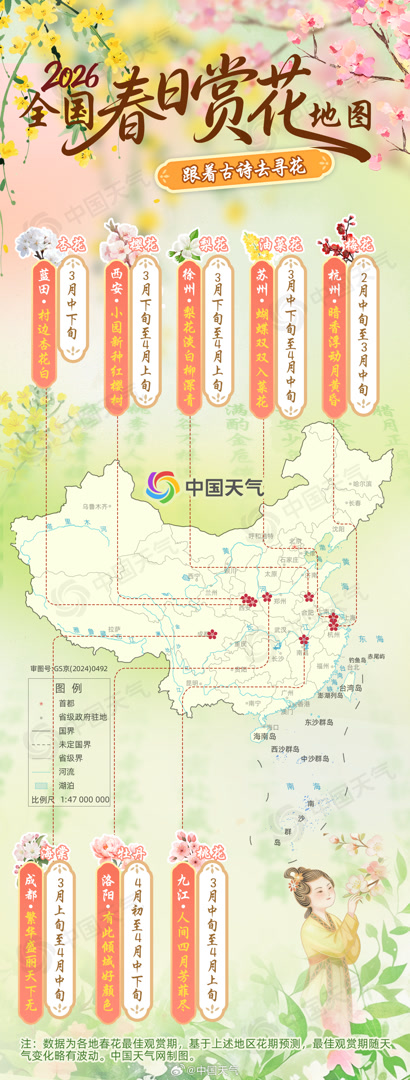 眼下已是惊蛰节气,仲春启幕,万物复苏。随着气温回升,各地花事繁忙起来,桃花红、杏花白、樱花粉……春日气息日渐浓郁。从古至今,春花与诗词相互交融,成为独属于中国人的春日浪漫。2026年春色正在铺展,循着花期与诗意,中国天气推出全国春日赏花地图,邀你赴一场古诗里的寻花之旅。