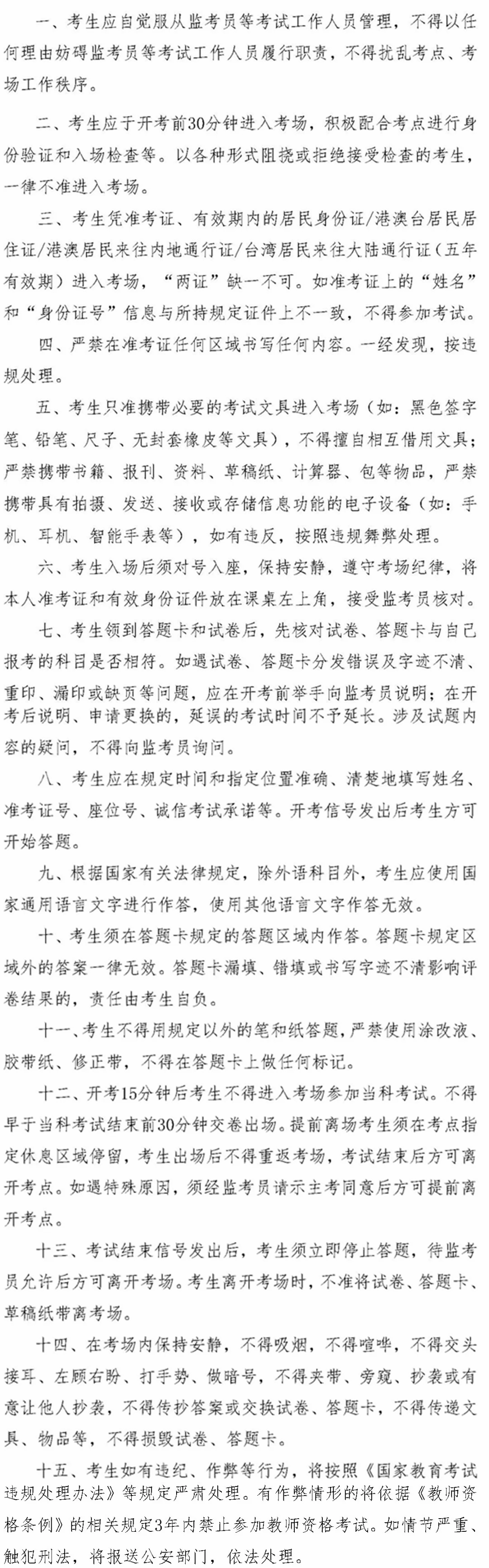 1. 中小学教师资格考试是法律规定的国家考试,是建设高素质、专业化、创新型教师队伍的基础性环节,事关教育立德树人根本任务,事关民族复兴伟业。考生必须牢固树立“师德师风第一”信念,坚决抵制任何考试违规作弊行为。