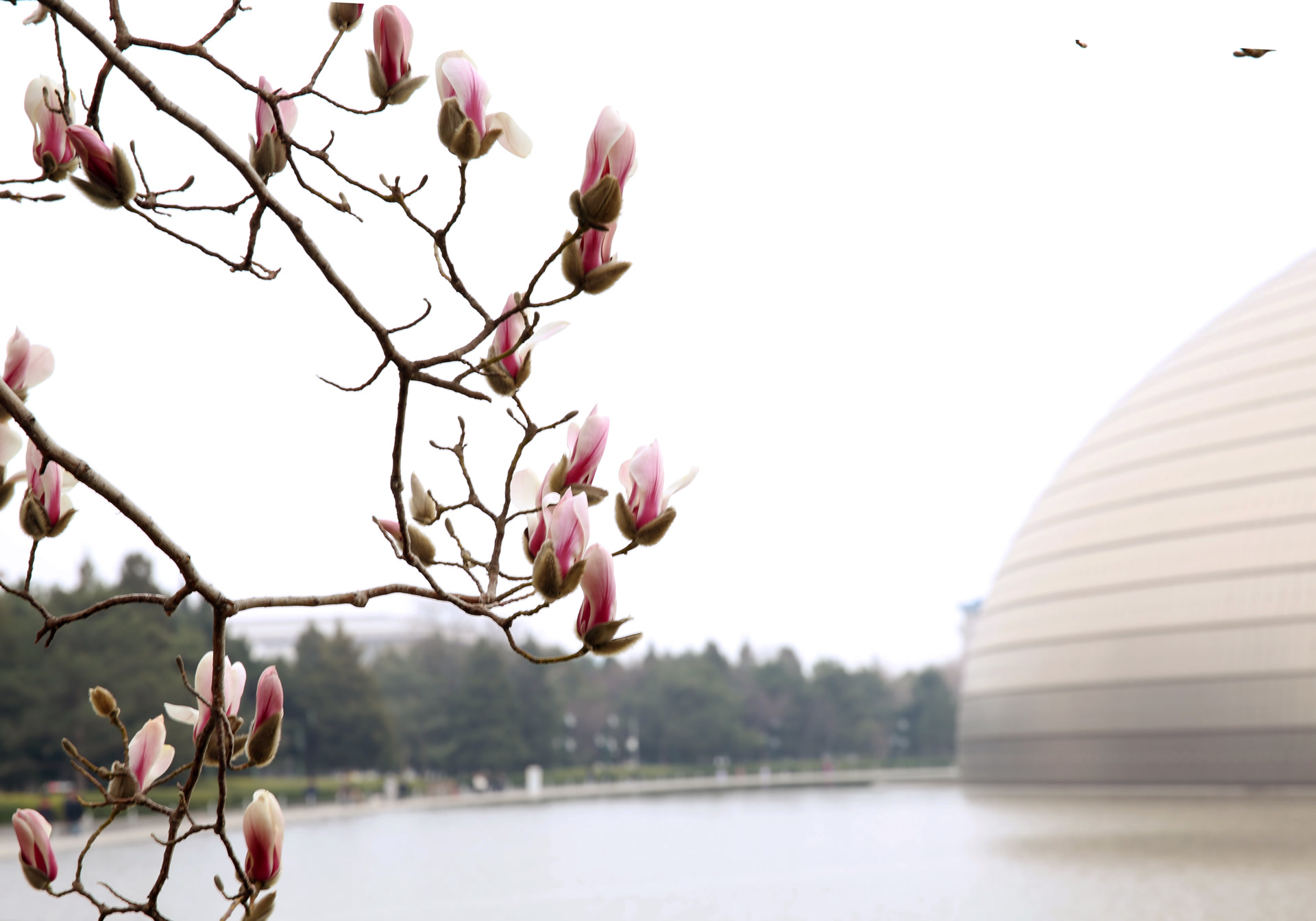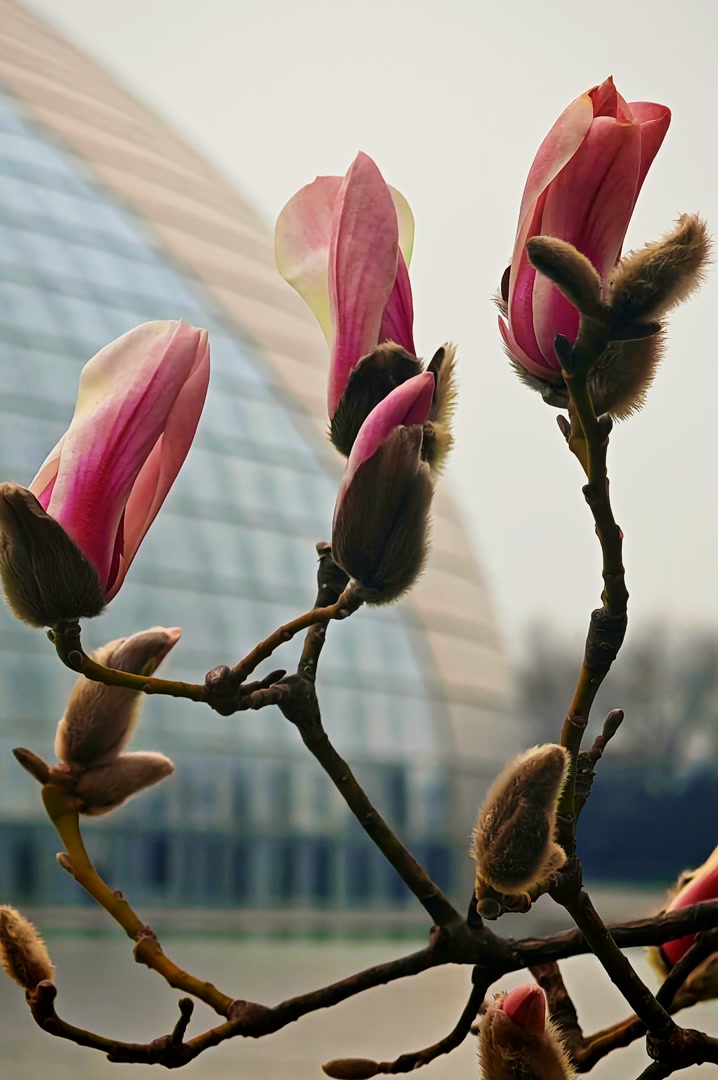 早春三月,北京寒意尚未完全褪去,国家大剧院波光粼粼的水池前,却有几棵广玉兰悄然破壳,吐露出毛茸茸的花苞与初绽的笑颜。