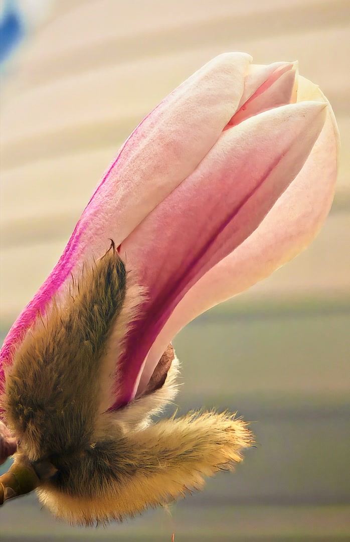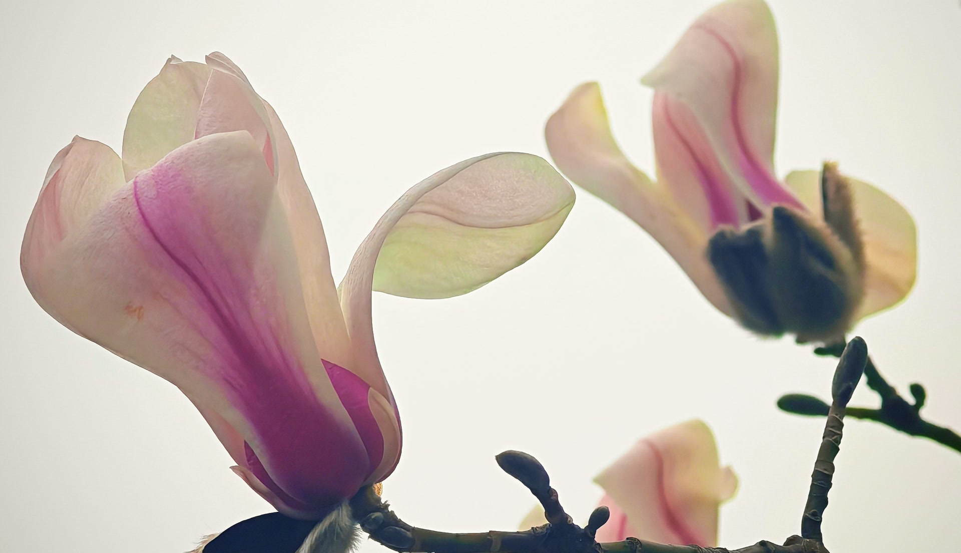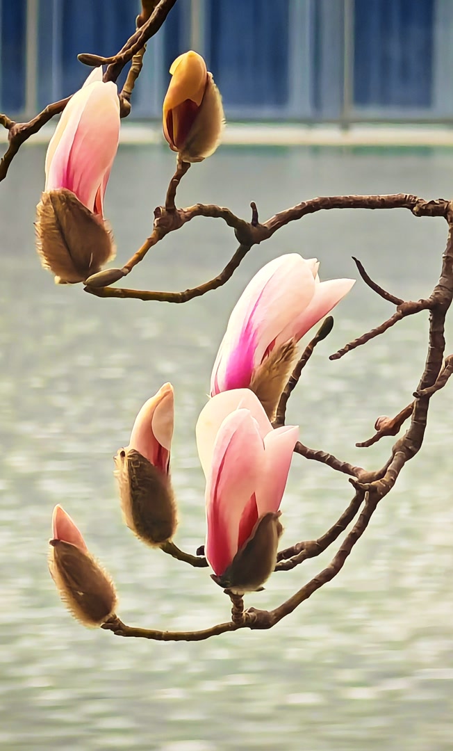 走近细看,树上那些毛茸茸的花苞刚从深褐色的鳞片中挣脱出来,有的已舒展开花瓣露出羊脂般的质地。在相机镜头中半透明的花瓣上,能看见细密的脉络,像极了宣纸上的水墨渗化。