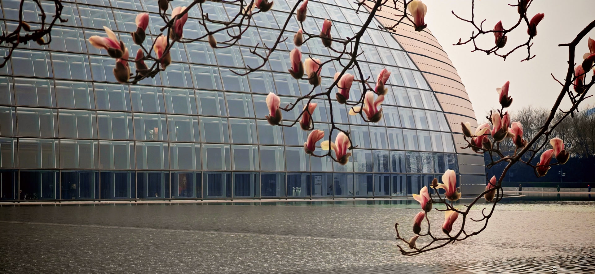 这些率先感知到春意的“信使”,与水池中央线条流畅、宛如巨蛋的银色剧院相映成趣——现代建筑的刚硬线条与自然生命的柔美舒展,构成了一幅动静相宜的都市春景图。