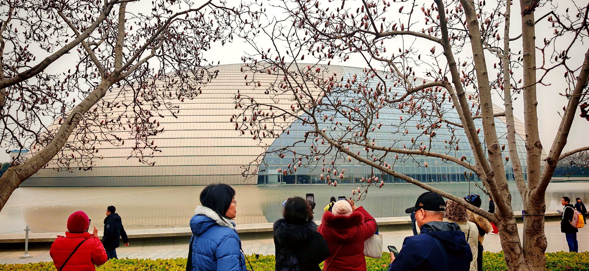 三月第一天,我来到国家大剧院,远远便望见一群身着五颜六色衣服的人,或举着手机或端着相机,围着几株玉兰树在拍摄。