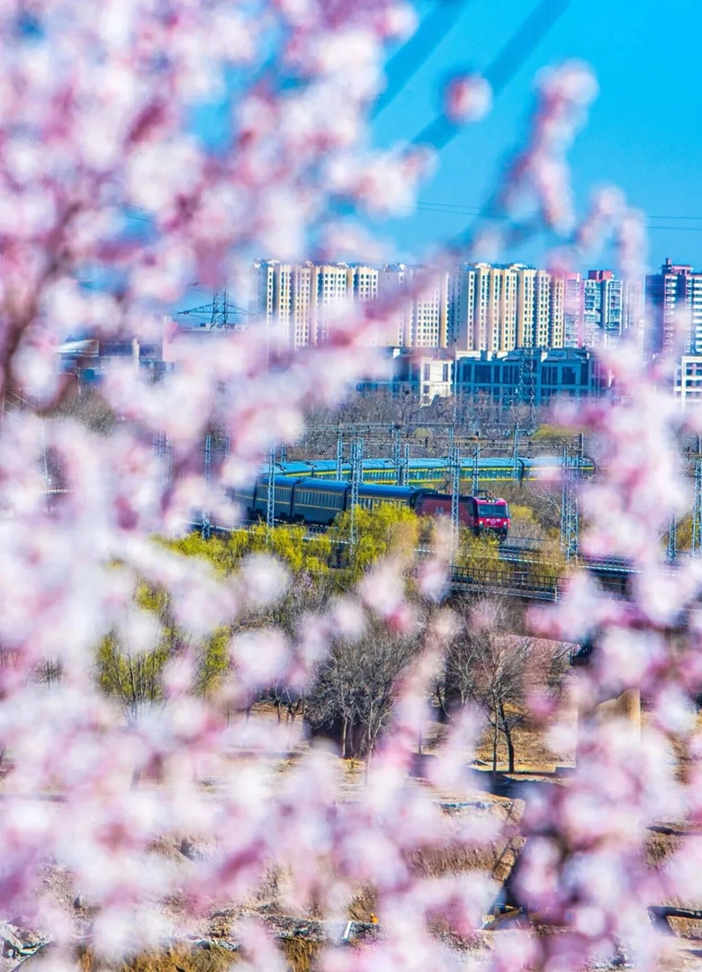 近几年,北京园博园鹰山300亩桃花谷已经成为初春摄影爱好者的聚集地,挨挨挤挤的桃花沿着山坡晕染开来,列车从花海中穿过,别有一番意味。