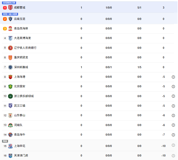 3月6日晚,2026赛季中超联赛正式开启。随着揭幕战成都蓉城队5比1战胜深圳新鹏程队,实时积分榜也有了变化。拿到3分暂时排名首位的成都队比排在最后两位的上海申花和天津津门虎队足足多了13分。