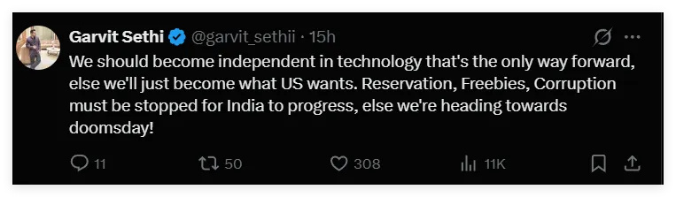还有印度网民表示,美国这番话说明印度应该争取科技独立,这样才不用看美国的脸色。