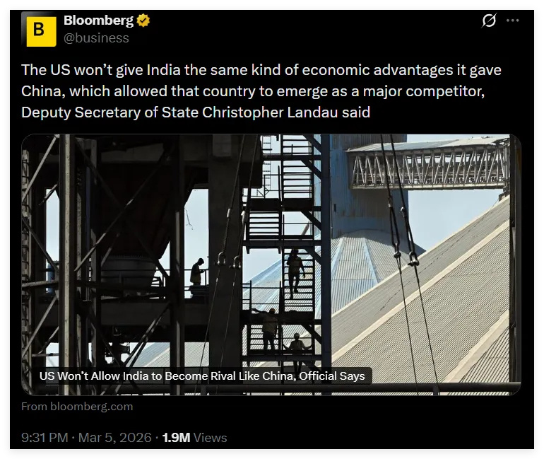 从彭博社的报道来看,兰道虽然在发言时表达了美国愿意与印度在多个领域合作的意愿,但这位美国高官却同时强调说,美国不会允许印度崛起成为能与美国抗衡的力量。