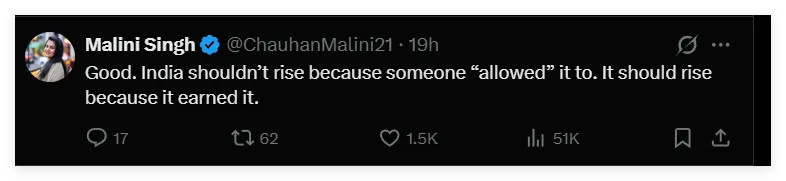 一位获得了1500点赞的印度女网民更表示,印度的崛起不靠谁的允许,而是靠自己的争取。