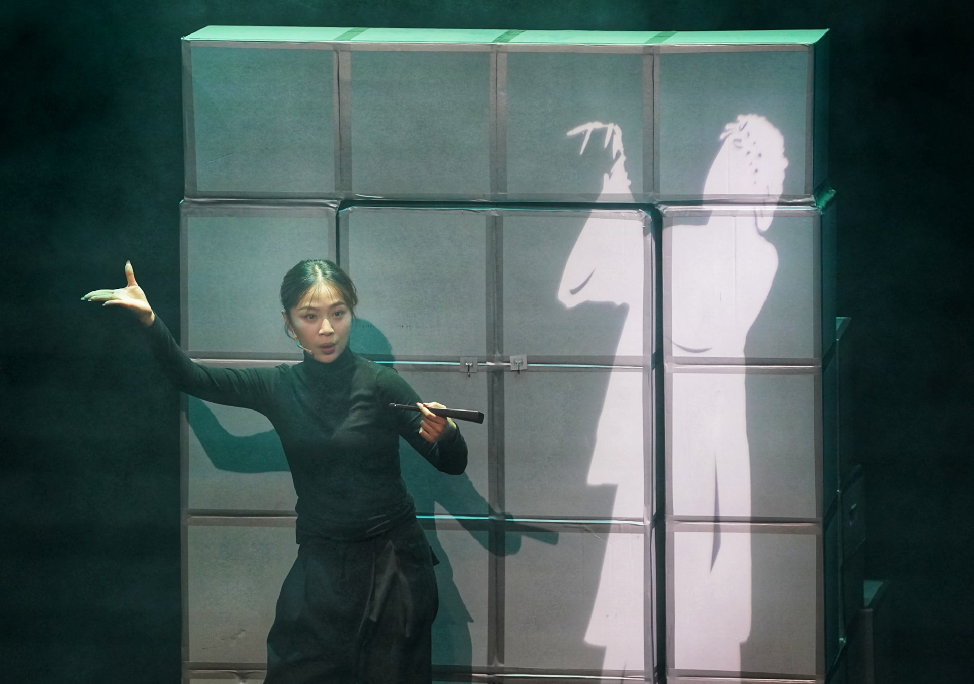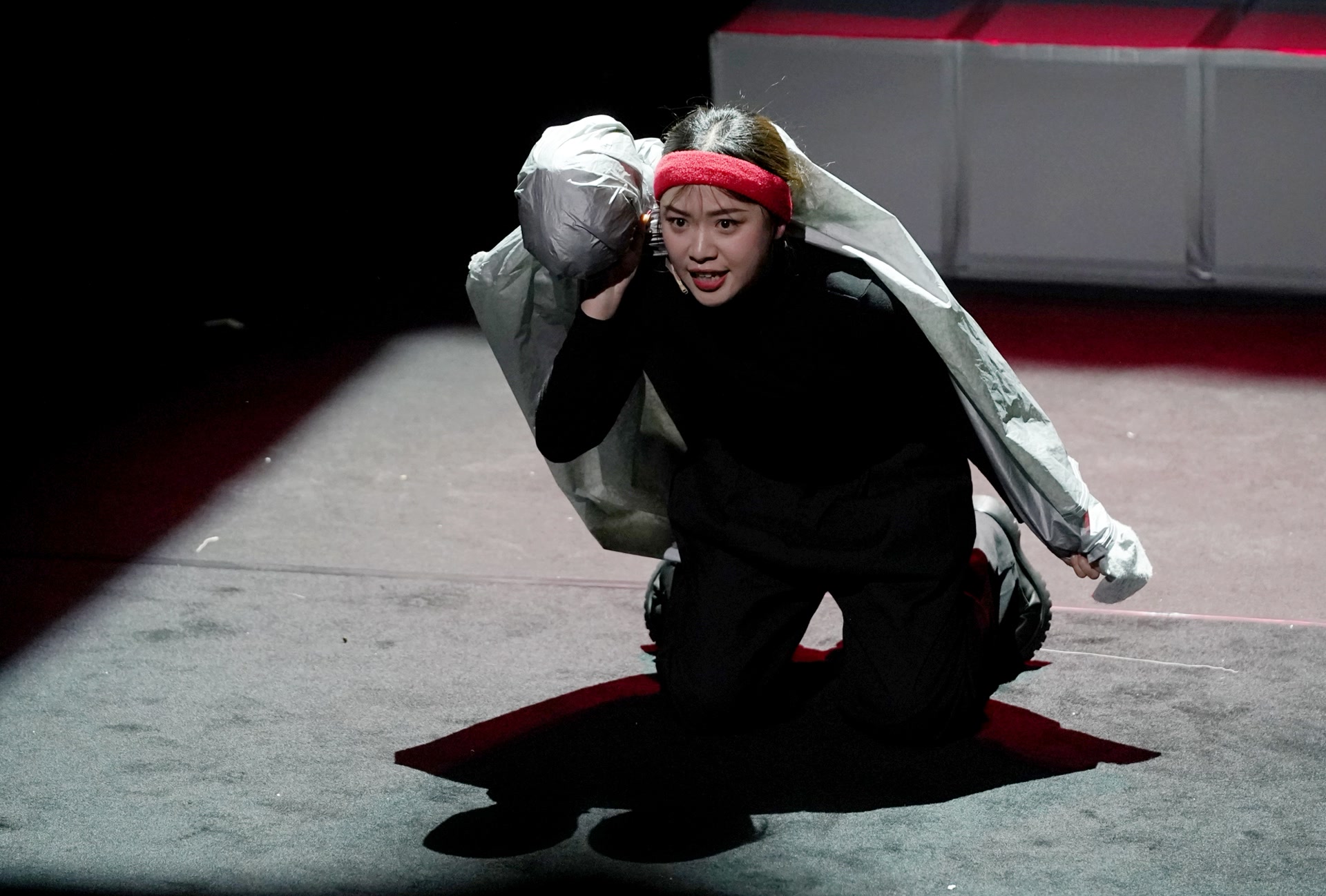 该剧的舞台设计极简,用方格灵活搭建出访谈现场、童年的家、拉面店等场景。剧中还有一段无台词的独角戏尤为惊艳:女主角仅凭一个塑料袋气球,在光影与肢体的配合下,演绎出邂逅爱情、交出身心、惨遭背叛、伤痕累累的人生经历。气球成为爱情的完美隐喻——它轻盈斑斓,仿佛乘风就能飞向云端;它饱满却脆弱,一次挤压、一个尖刺,甚至只是时间的流逝,都能让它变形或毁灭。
