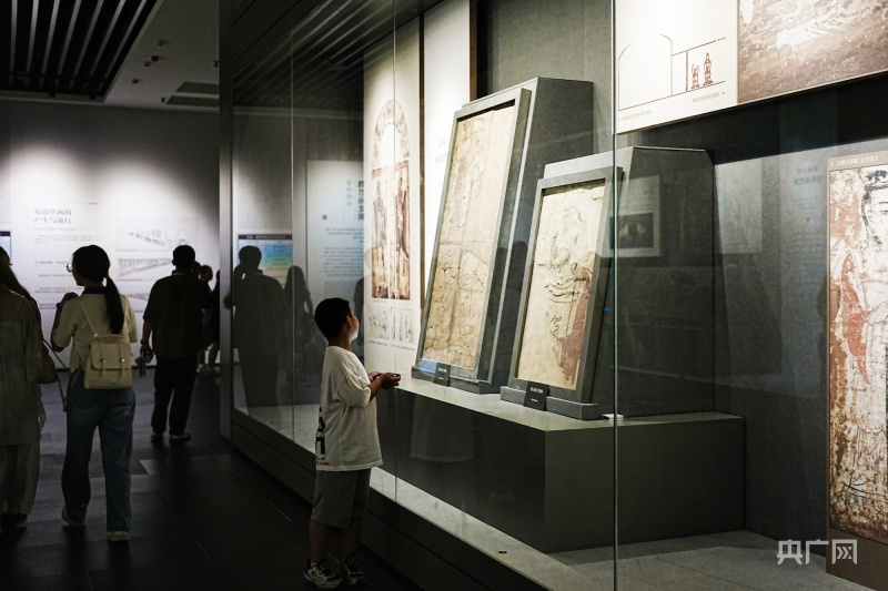 孩子正踮脚观看洛阳古墓博物馆内的壁画(央广网记者 张羲轮 摄)