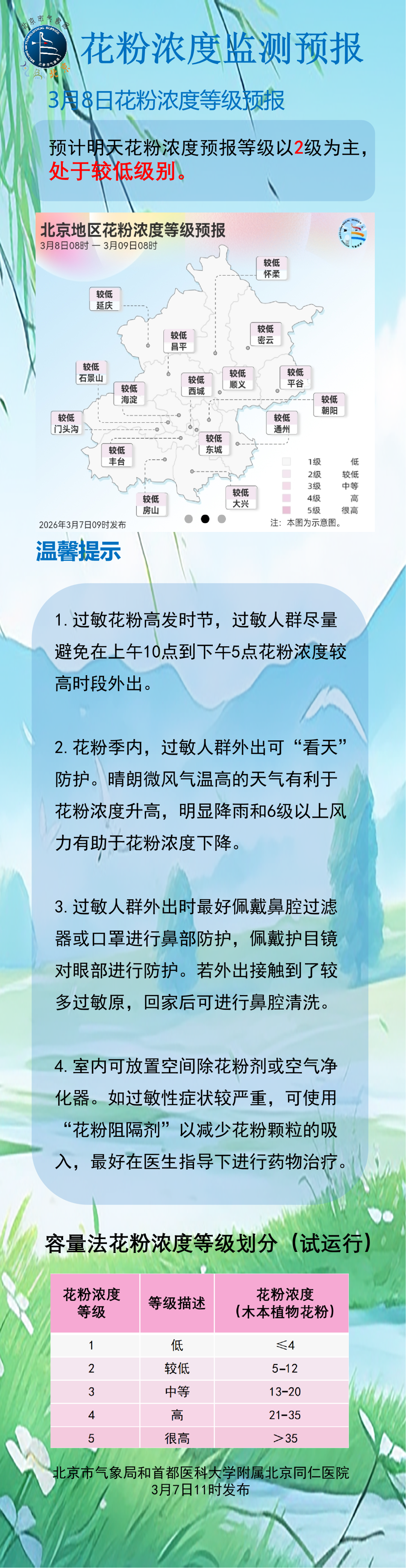 昨日北京城区大部花粉浓度等级为2级,较低级别,主要致敏花粉种类为榆科、柏科为主。预计3月7日花粉浓度以2级为主,为较低级别(5~12粒/立方米)。