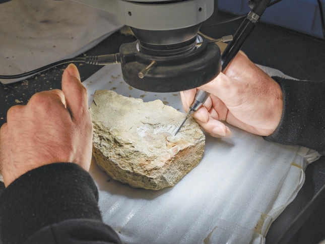 仔细观察钝齿宏颌鱼头骨化石,可以在化石边的围岩处,看到许许多多细密的网状交织痕迹,这是科研团队修复化石时留下的“针脚”。