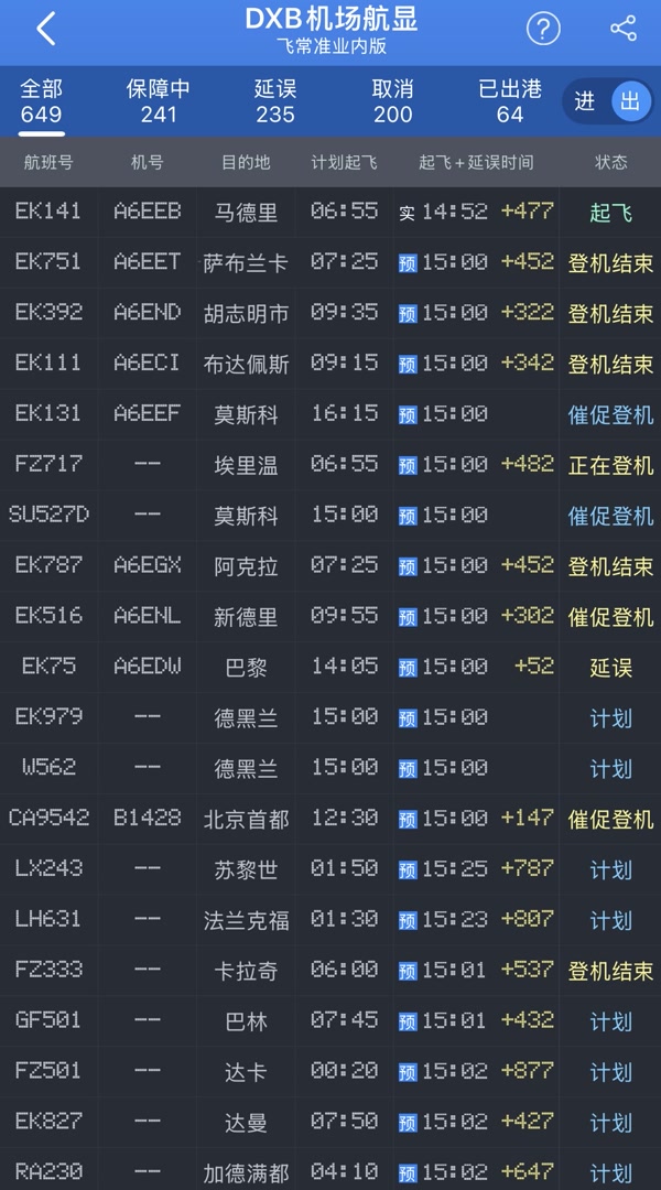 据飞常准App显示,当地时间12时37分起,迪拜机场已逐渐恢复运营。截至北京时间19时,3月7日迪拜机场已出港64架次航班。