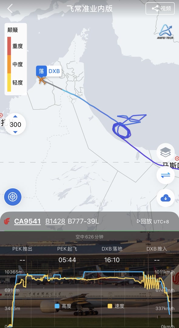 阿联酋迪拜国际机场3月7日上午传出爆炸声,阿联酋一度宣布暂停所有进出迪拜的航班。据了解,目前迪拜国际机场已重新开放,国航北京-迪拜的CA9541航班在延误近两小时后,于当地时间12点10分(北京时间16点10分)安全降落迪拜国际机场。航迹图显示,该航班一度在阿曼上空盘旋近9圈。