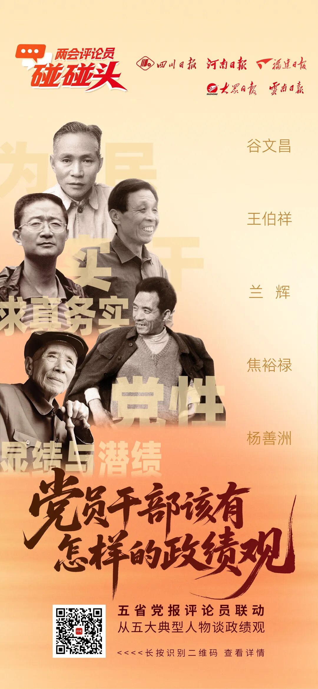 围绕如何回答好“政绩为谁而树、树什么样的政绩、靠什么树政绩”,四川日报联动河南日报、福建日报、大众日报、云南日报,重温兰辉、焦裕禄、谷文昌、王伯祥、杨善洲五位典型人物的事迹,评述“党员干部该有怎样的政绩观”。
