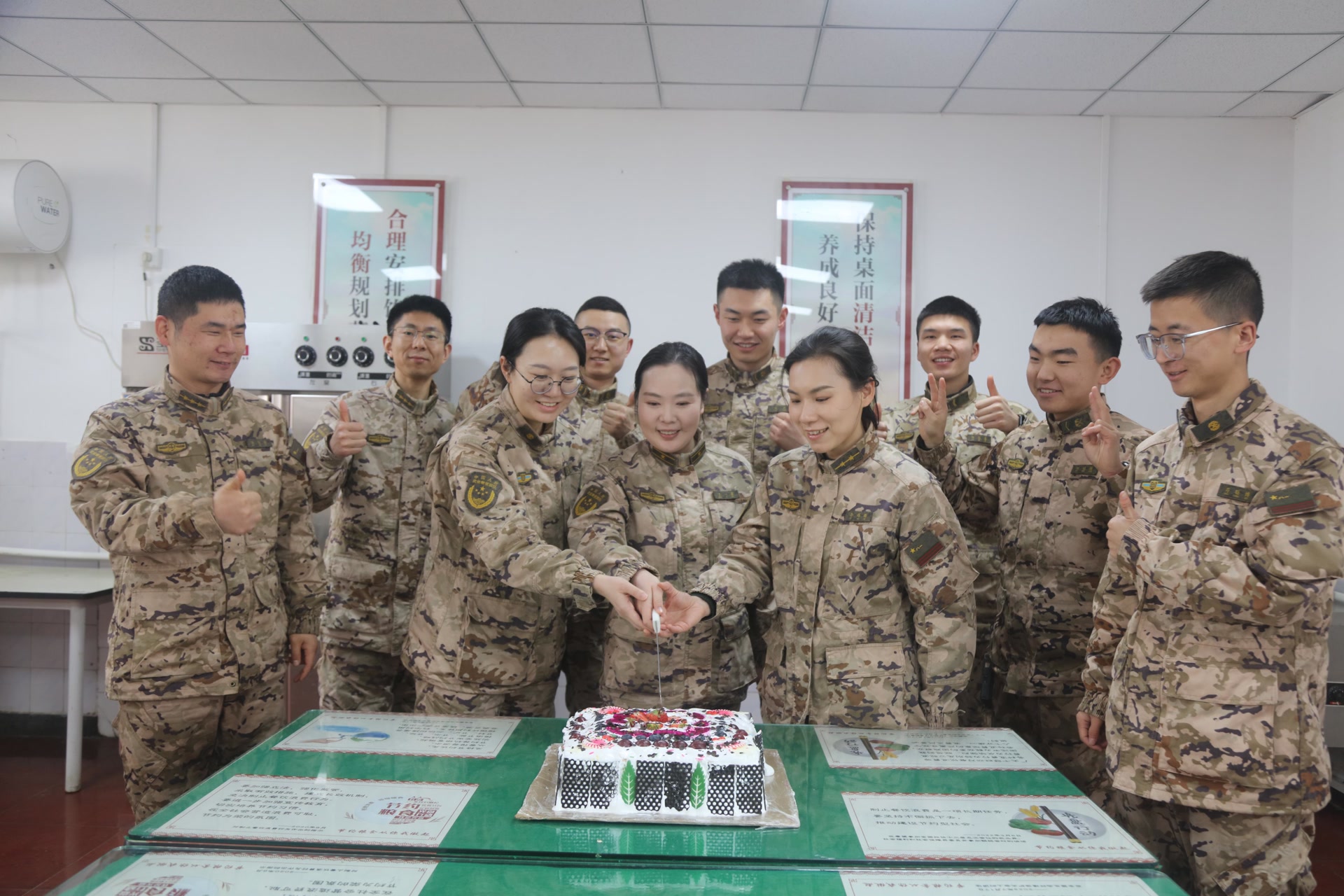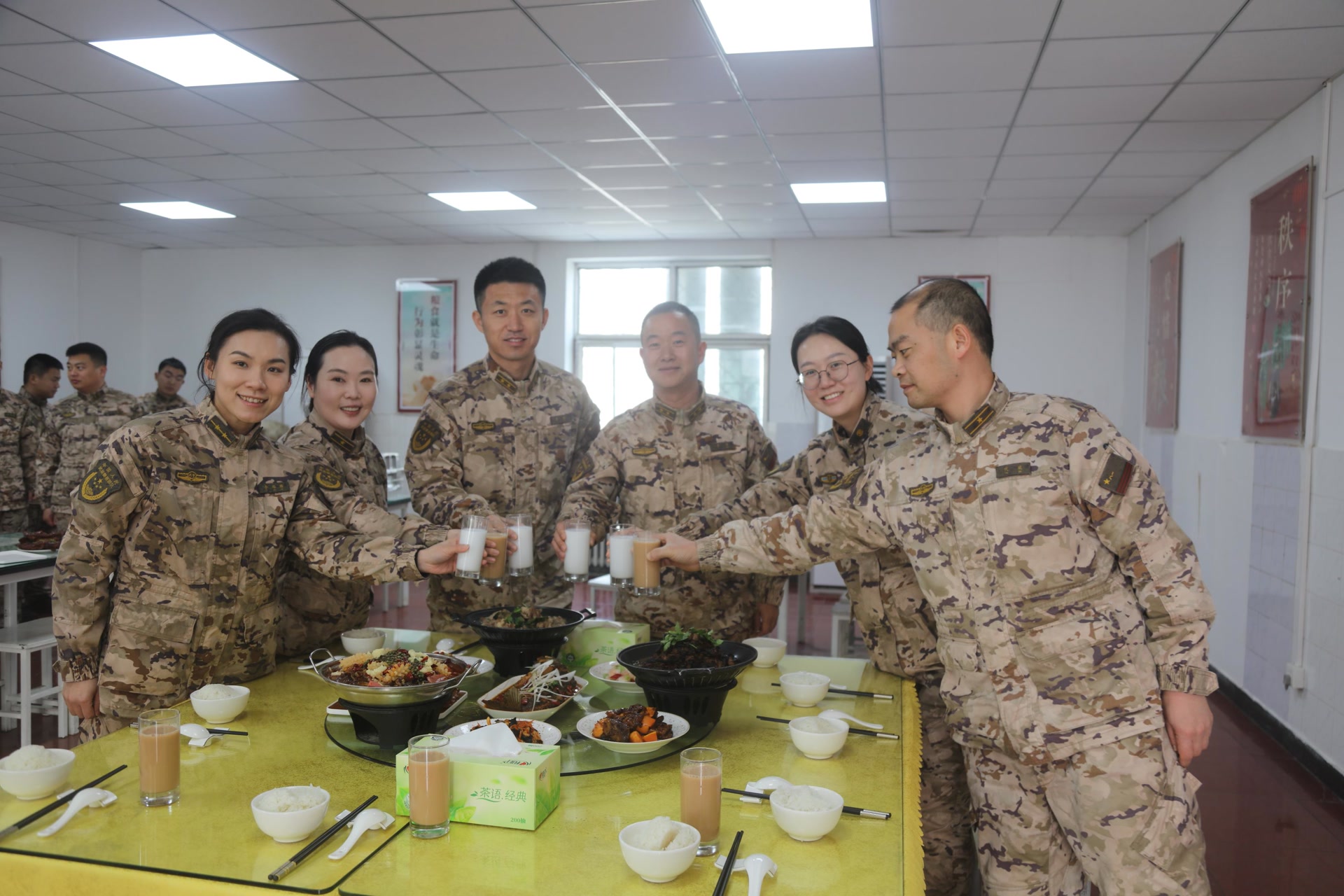 随后,部队还组织了集体聚餐、生日蛋糕分享会等温馨活动。食堂里,丰盛的饭菜、香甜的蛋糕与官兵们的欢声笑语交织在一起,大家举杯同庆、共话情谊,在轻松愉悦的氛围中感受部队大家庭的温暖。