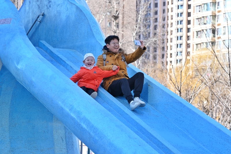 午后,北小河畔有了些许春意,滑梯周边热闹非凡。大象造型的滑梯圆润敦实,格外吸睛,尾部设平缓台阶,脊背化作安全护栏,长长的鼻子成为顺滑滑道,全身采用圆角处理,兼顾美观与安全。孩子们争先恐后爬上象背,顺着象鼻俯冲而下,乐此不疲。很多家长驻足拍照,定格童年美好瞬间。“一下子就勾起童年回忆了!”带着儿子玩耍的市民张炜说。