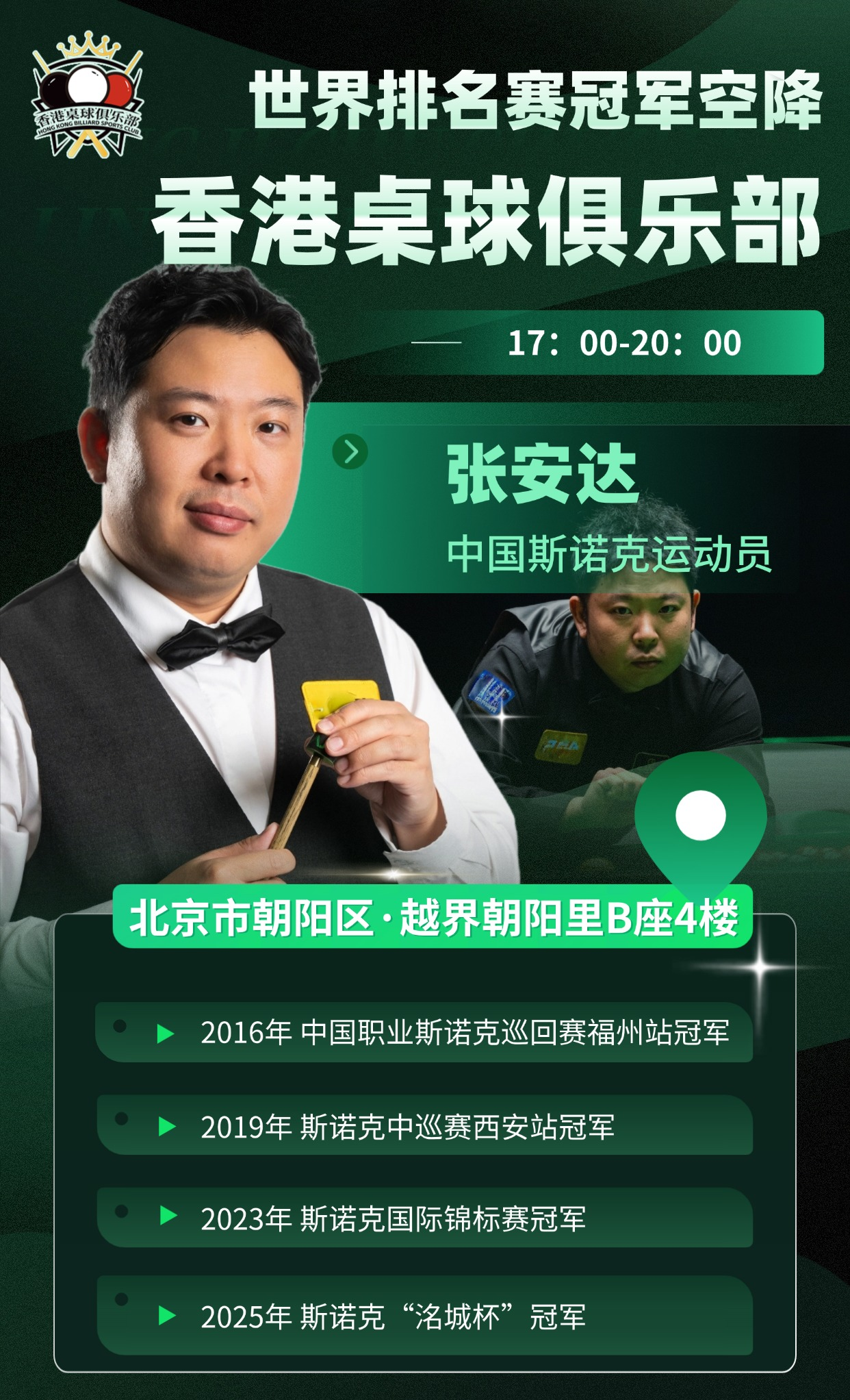 8日傍晚,知名斯诺克运动员张安达还将亲临现场,与桌球爱好者展开互动交流。