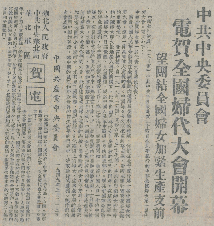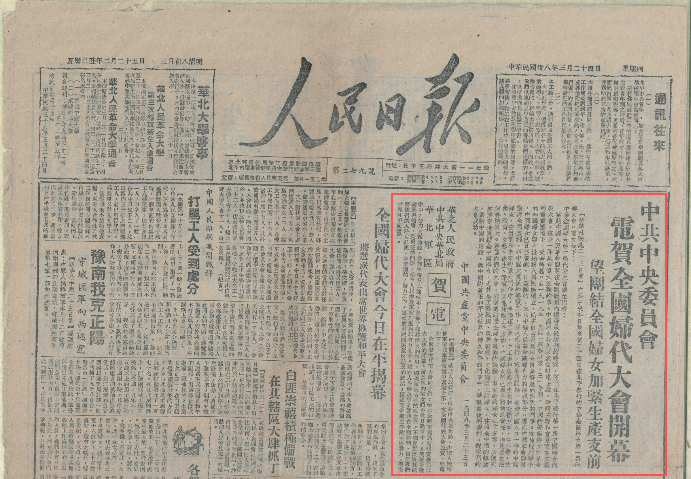 ▲图为1949年3月24日,刊有“中共中央委员会电贺全国妇女代表大会开幕”等内容的《人民日报》。