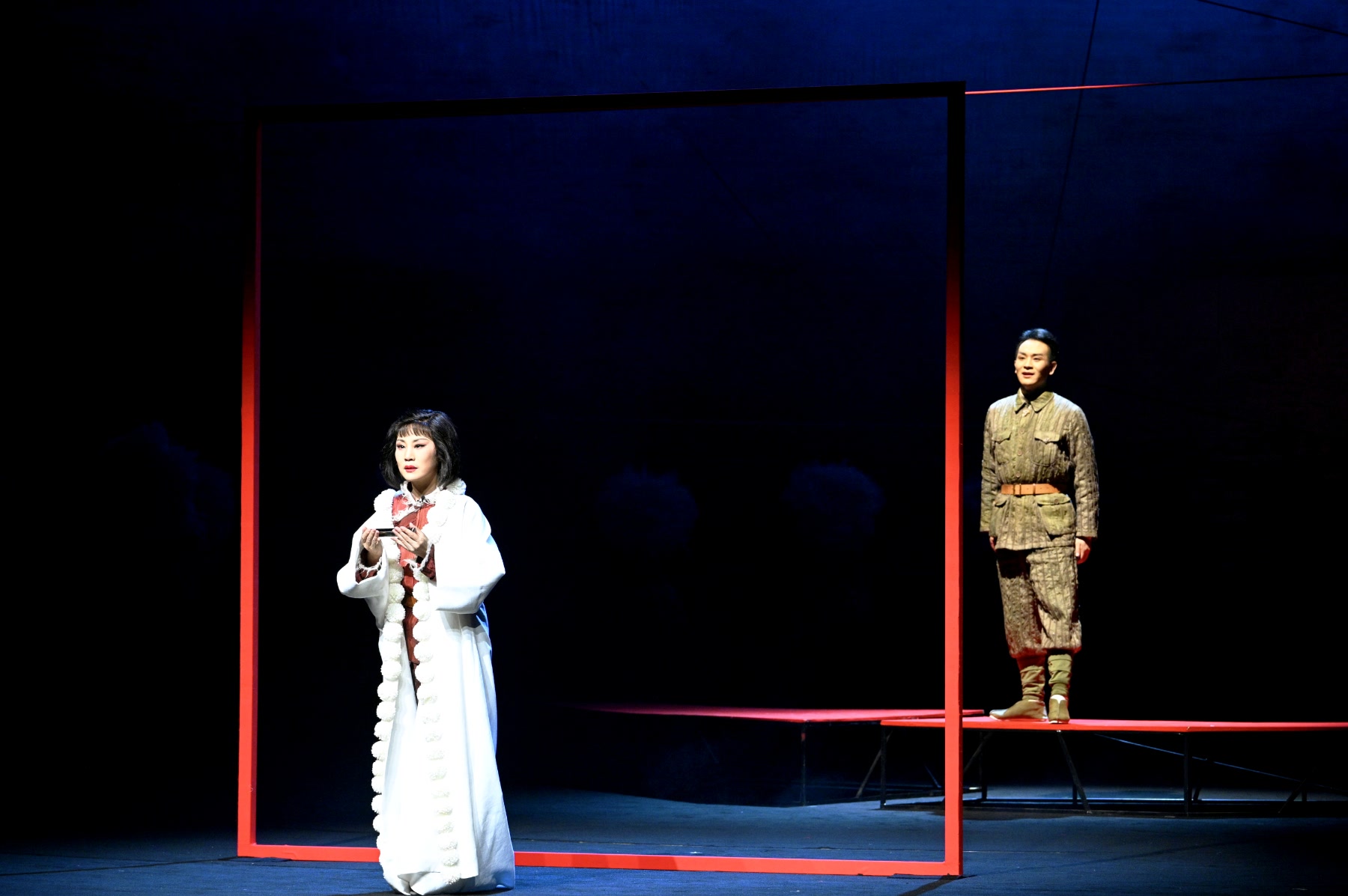 强烈的文学性、丰富的隐喻,在《远去的白马》中比比皆是。舞台中央,极简造型的巨大弧形幕墙如一轴历史的长卷徐徐展开,粗犷质感沉淀着烽火岁月的重量,交错于半空的红色线条、在轨道上旋转的红色门框既如鲜血刺目,也如革命先烈的理想火热不熄,同时流畅精准地营造了不同的表演场景,铺陈人物的命运波折——戏曲的写意融合当代的审美,为常常予人质朴甚至些许粗粝印象的河北梆子焕发了新的表达。