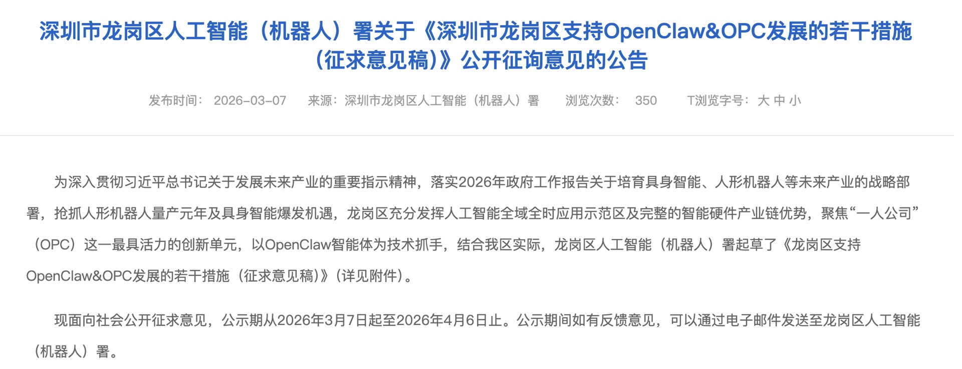 深圳市龙岗区支持OpenClaw&OPC发展的若干措施