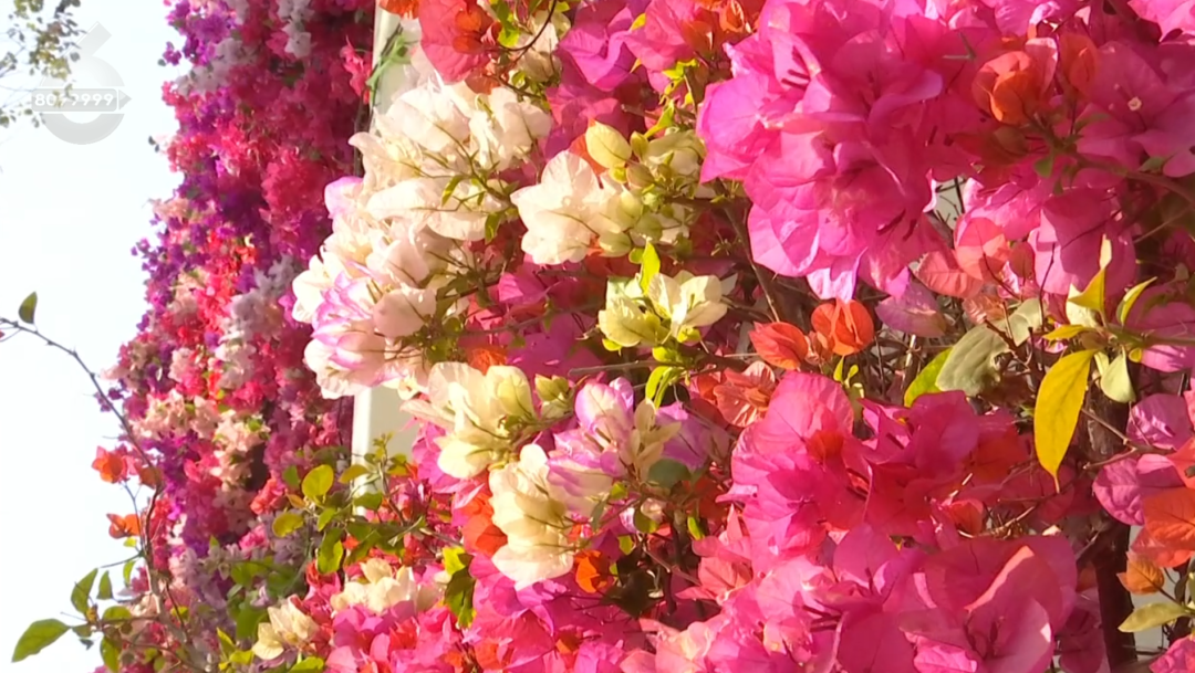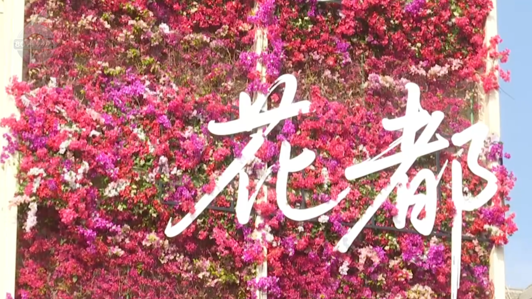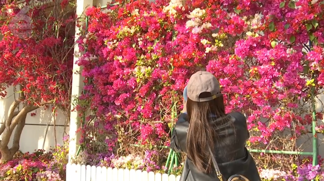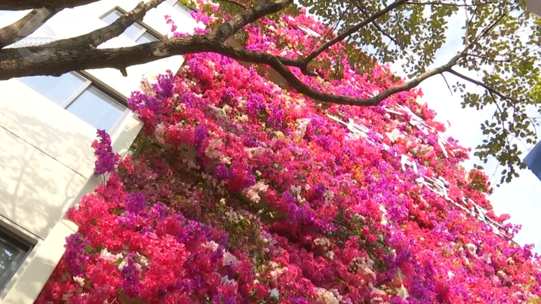 春日的阳光洒在五一路的这面花墙上,层层叠叠的三角梅顺着建筑墙体肆意生长,从地面一直攀爬到六层楼顶。