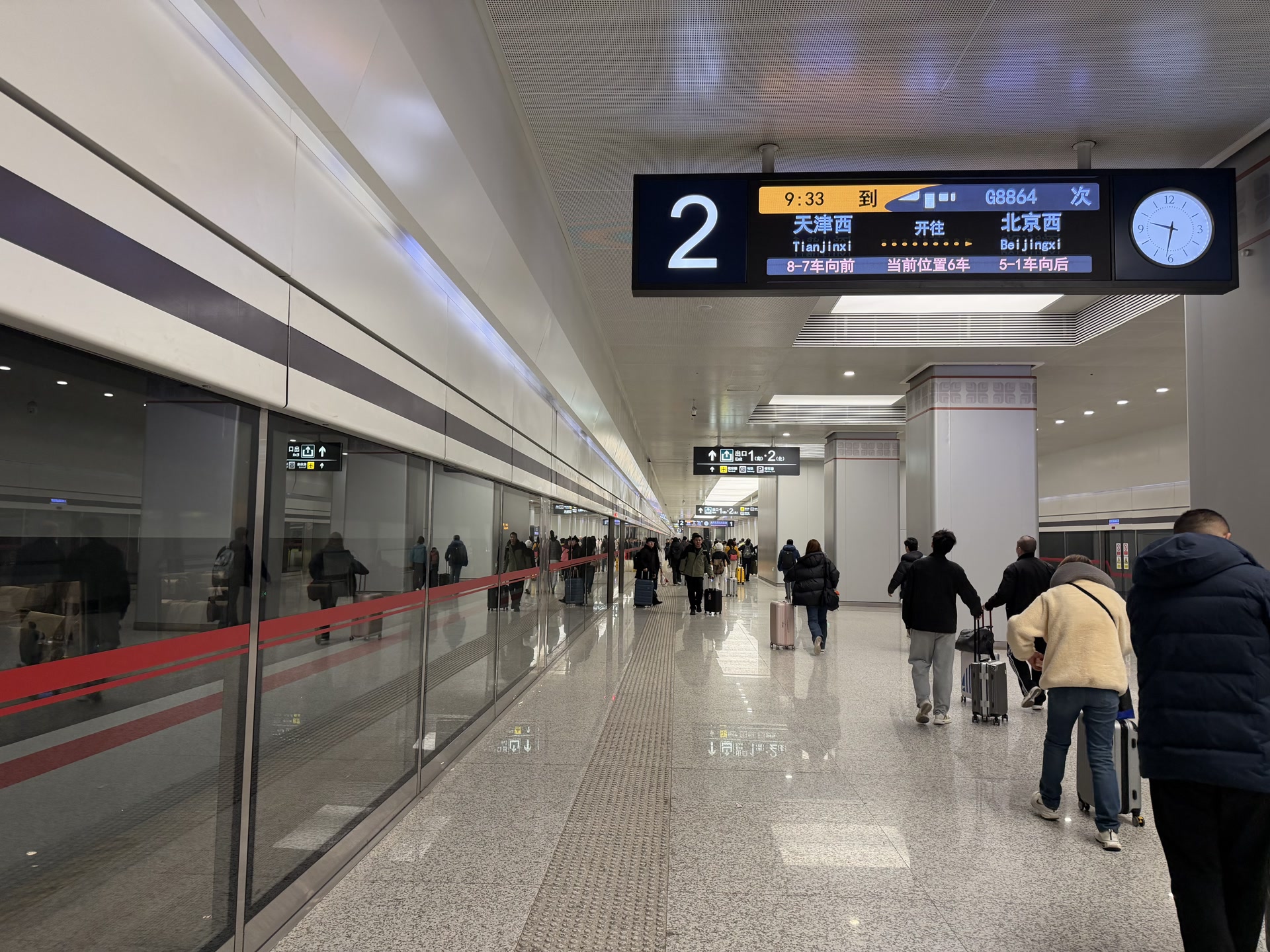 8点38分,列车准时抵达天津西站,旅客鱼贯而出,奔向各自的目的地。此时,列车又转换为G8864次,385名旅客陆续登上列车,大件行李架逐渐被塞满。16分钟后,列车向着大兴机场的方向开去,最后回到北京西站。