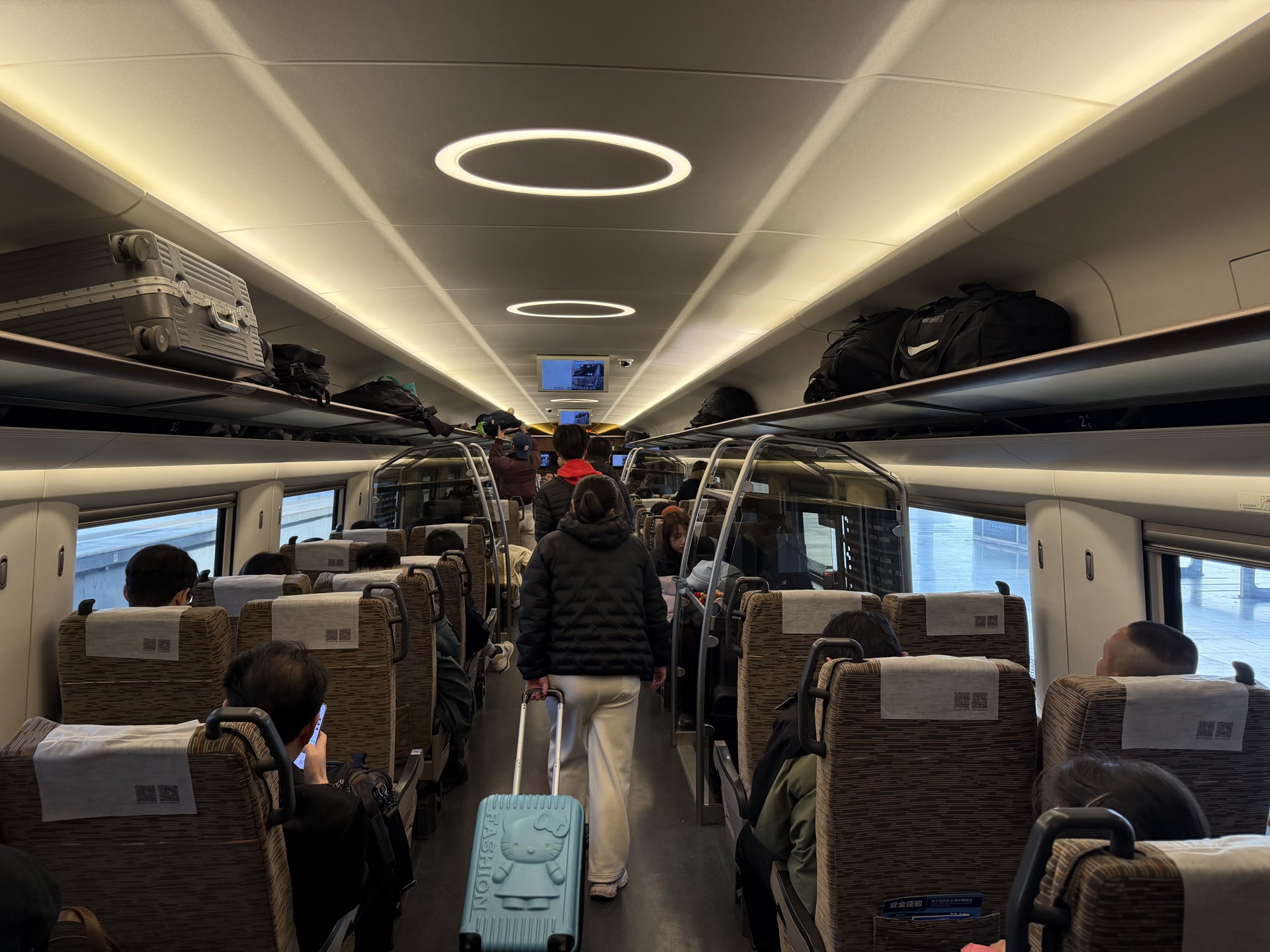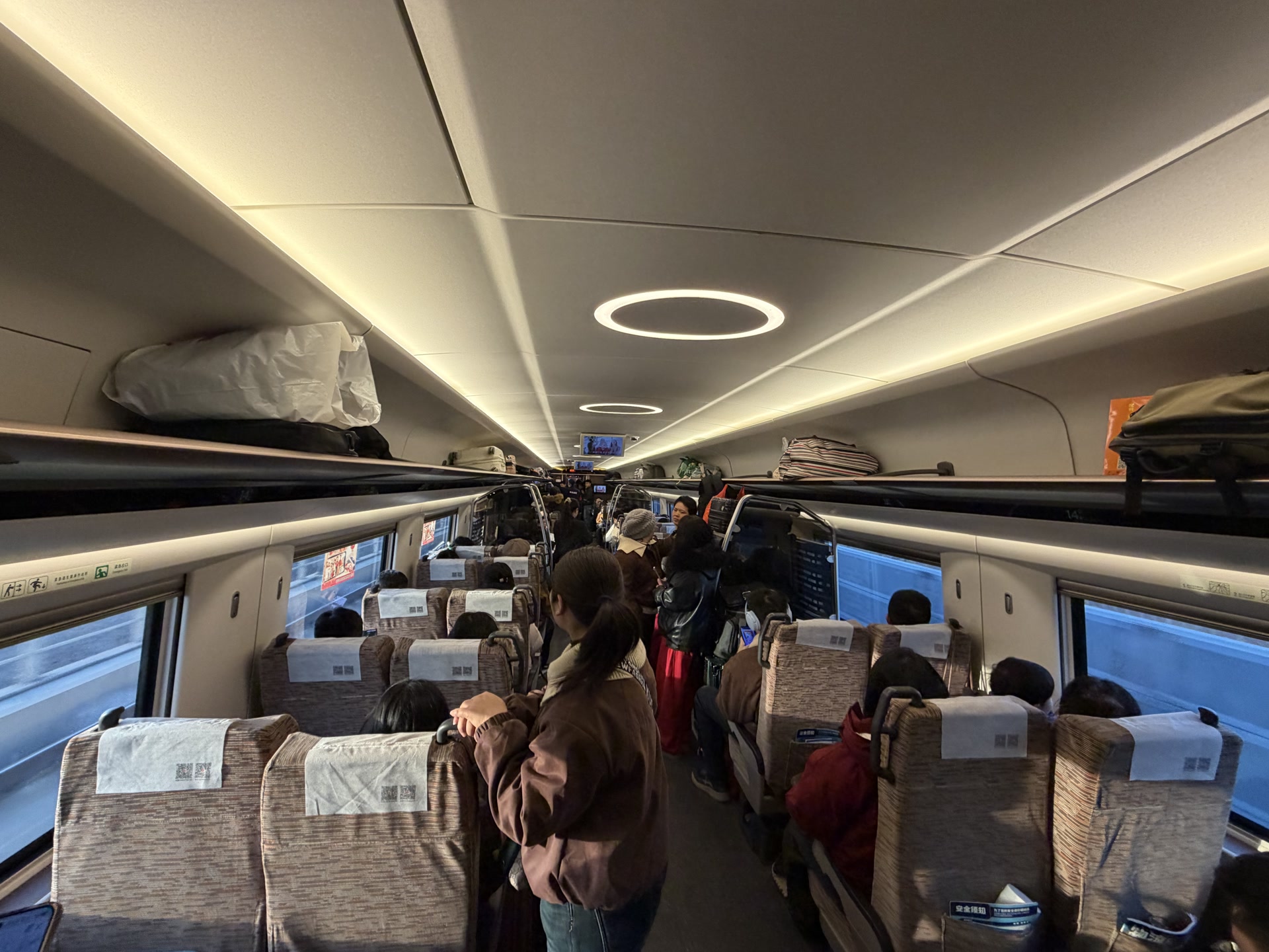 2号车厢是静音车厢,可早上的环线高铁,所有车厢都十分安静,只能听到列车规律行驶的“呼呼”声,人们交流时都刻意压低了嗓子。