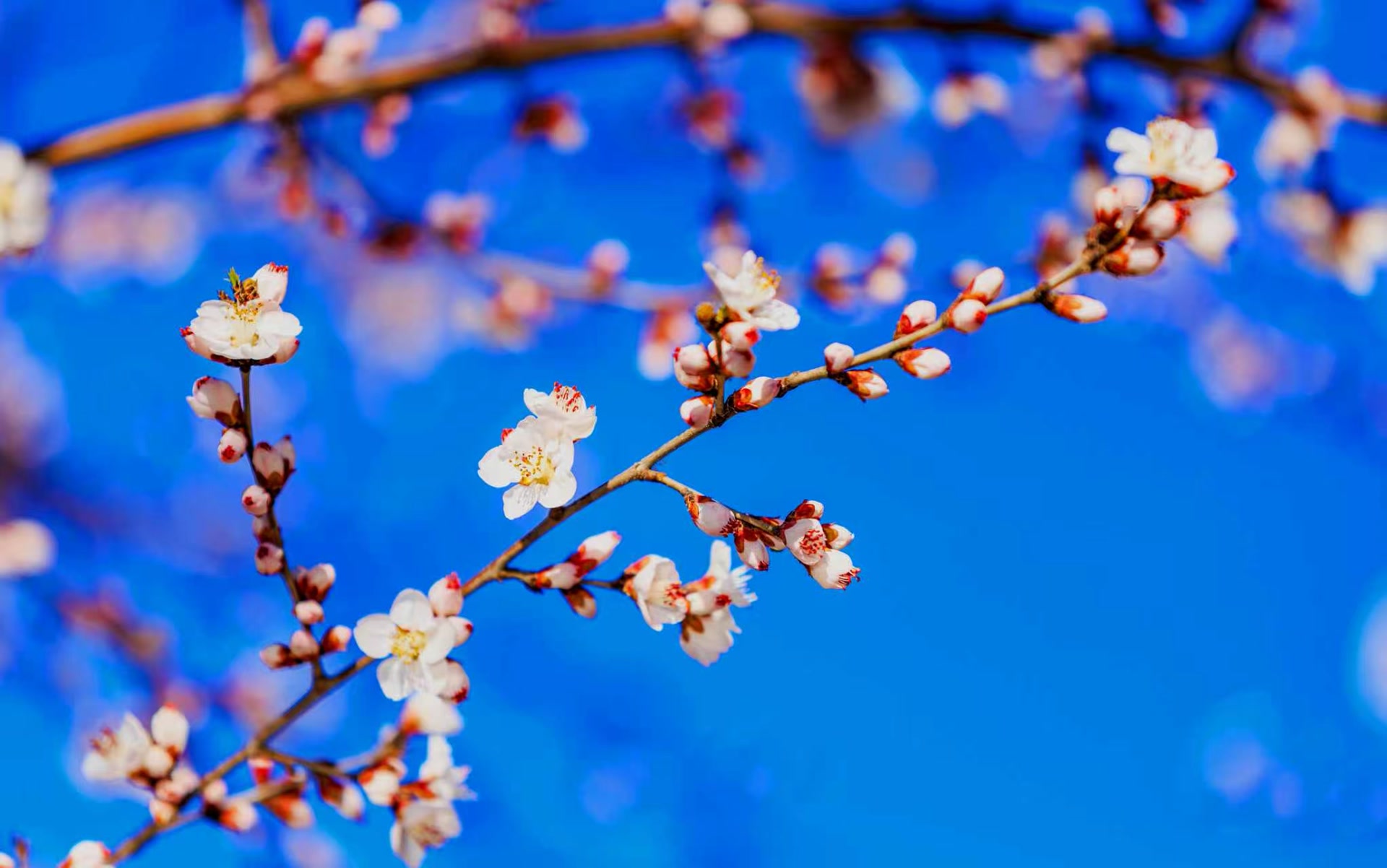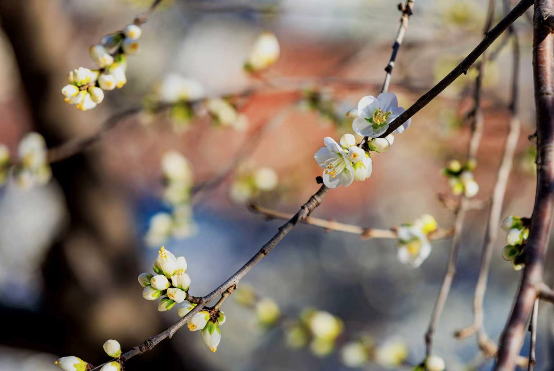 3月9日,北京朝阳区十里堡二道沟河畔,山桃花初绽放,一簇簇的花骨朵当中,数枝桃花抢先盛开,迎接明媚春天。