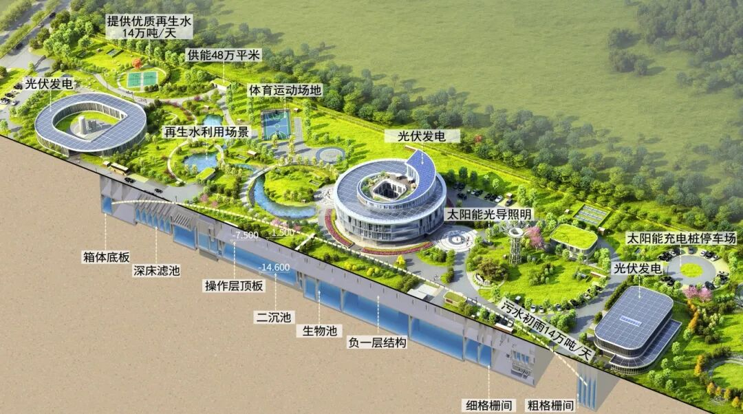 一期建设用地共计4.78万平方米,设计处理规模7万吨/日,目前正按计划稳步推进。项目服务范围覆盖副中心污水处理流域IV片区,定位为集污水处理、水源热泵、光伏发电、再生水回用于一体的新型综合资源利用中心,致力于打造国家级污水处理绿色低碳标杆示范厂。