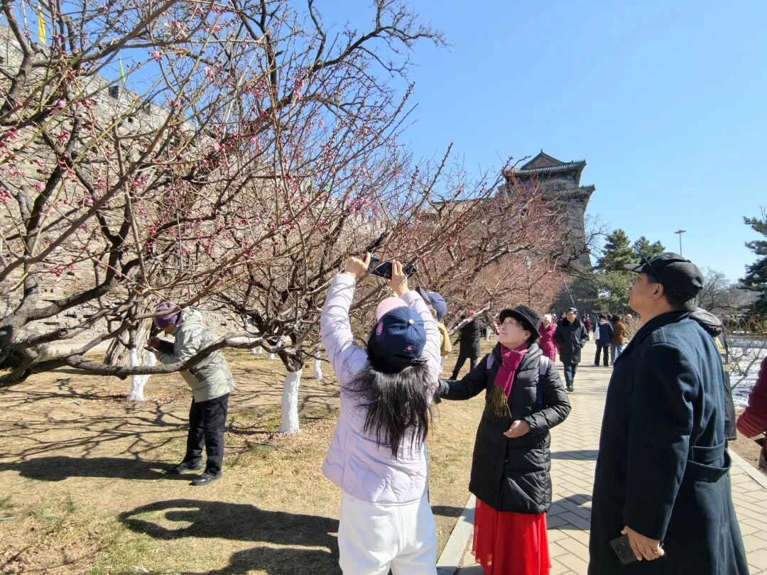 为让游客沉浸式观赏梅花之美,公园本次重点打造了“古垣新春”“梅园锦绣”“西岭香远”三处特色赏梅点位。位于公园东侧角楼下的“古垣新春”,以粉色系梅花为主,古垣角楼与烂漫梅花交相辉映,勾勒出别样春日图景,人面桃花、绿萼、大羽、宫粉等品种齐聚于此;公园中部信号所西侧甬路广场旁的“梅园锦绣”,集结了朱砂、绿萼、人面桃花等红、白、粉各色优质梅花品种,株型、长势好的品种较为集中,营造出梅海锦绣、繁花竞放的热闹景致;公园最西侧劳模广场边的“西岭香远”,则以香韵浓郁的梅花品种为核心,花色以白色、淡粉色为主,跳枝、傅粉等品种暗香浮动,沁人心脾。此外,园内还有龙游、垂枝梅、黄山黄香等特色梅花品种,让市民游客可以大饱眼福。