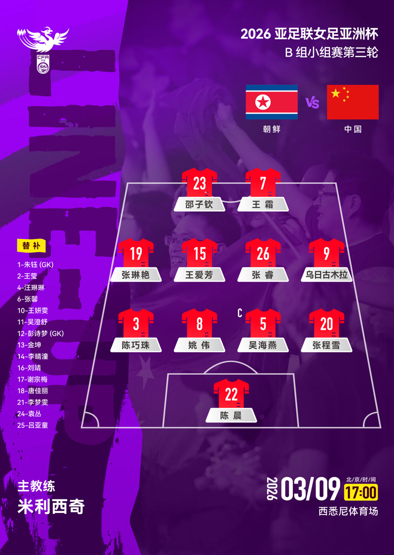 北京时间3月9日下午5时,中国女足将在2026年亚洲杯B组末轮比赛中对阵朝鲜队。刚刚,中国女足本场比赛首发阵容出炉,主帅米利西奇在前场派出王霜、张琳艳、乌日古木拉和邵子钦的组合。