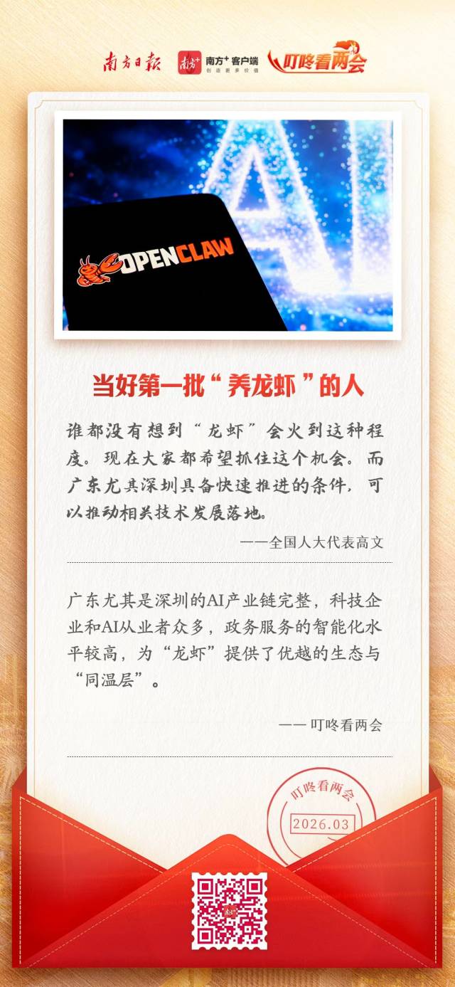 今年全国两会上,多位代表委员关注到这一现象。广东代表团代表小组会议现场,全国人大代表、中国工程院院士高文就为在场的人作了科普。他感叹“马化腾也没想到这只‘龙虾’火到这种程度”,并表示“现在大家都希望抓住这个机会,广东尤其深圳具备快速推进的条件,可以推动相关技术发展落地”。全国政协委员王坚也认为“OpenClaw会很快便宜下来并普及”。