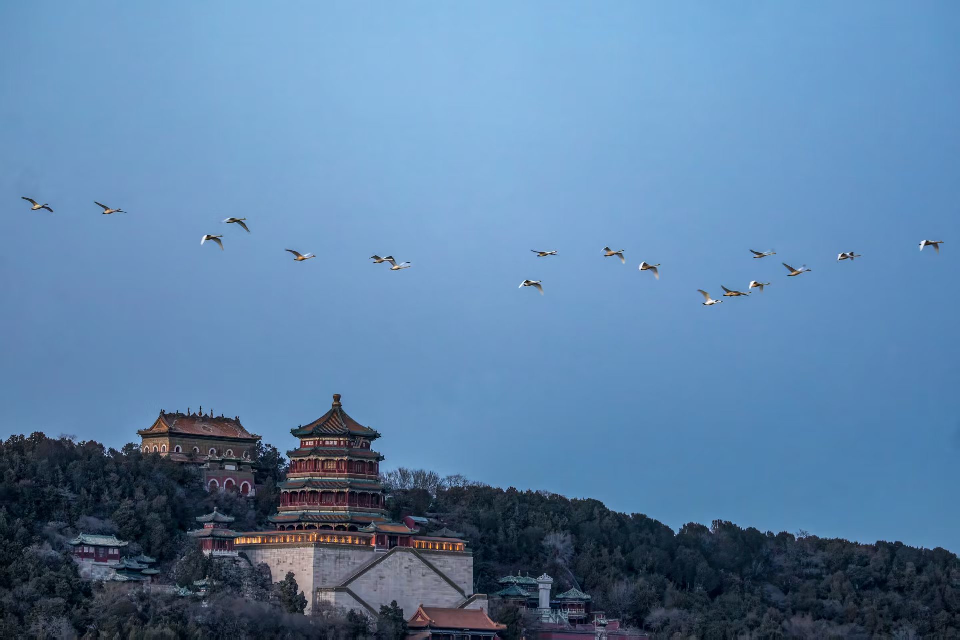 2月12日,首批2只大天鹅飞抵颐和园昆明湖,拉开了今年春季候鸟迁徙的序幕。从2月25日开始,每天均有数只到数十只天鹅集群抵达,排成“一”字形长队,在天空中演绎着春日的序曲。据悉,这些天鹅主要来自长江以南的鄱阳湖流域,沿着祖先刻在基因中的迁徙路线,飞越千山万水,最终选择昆明湖作为休整驿站。