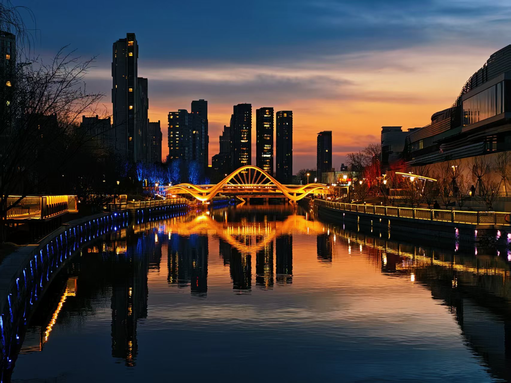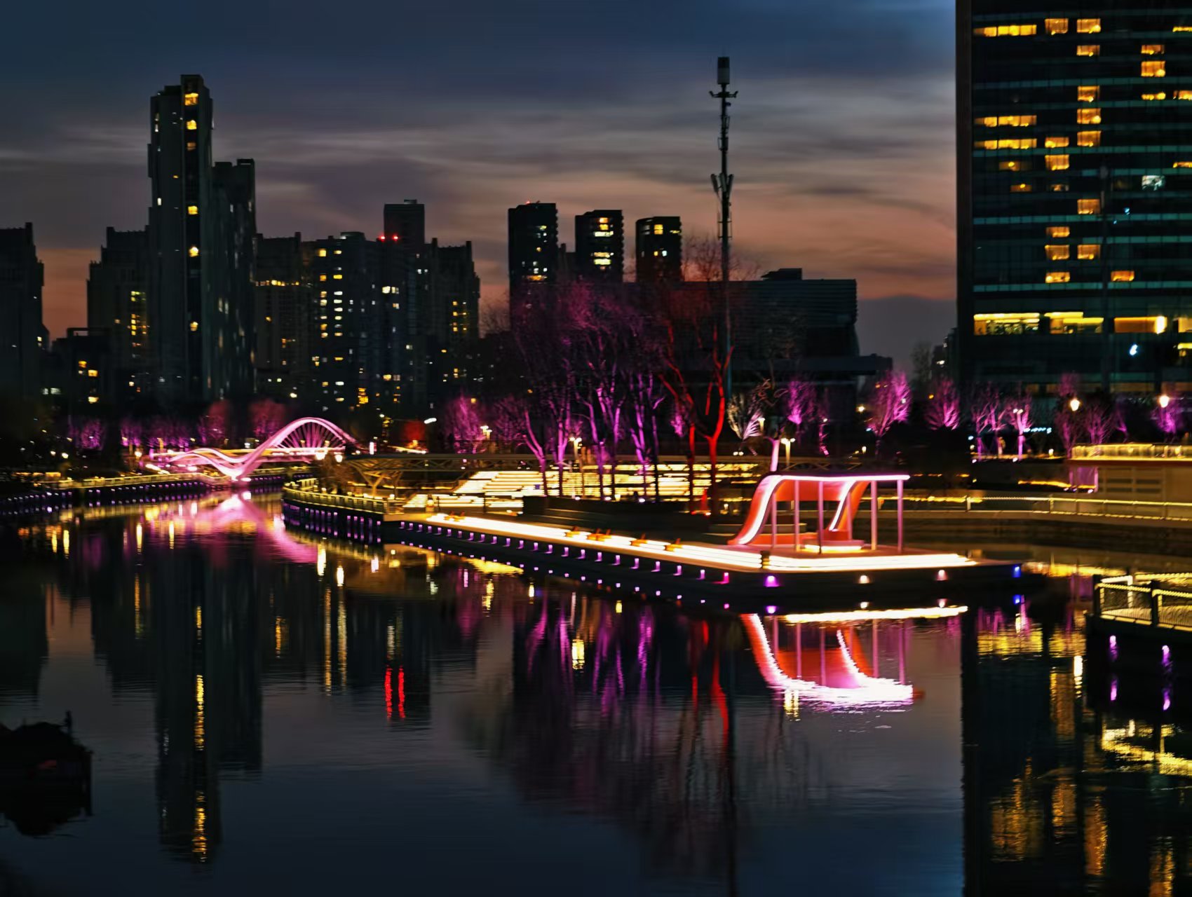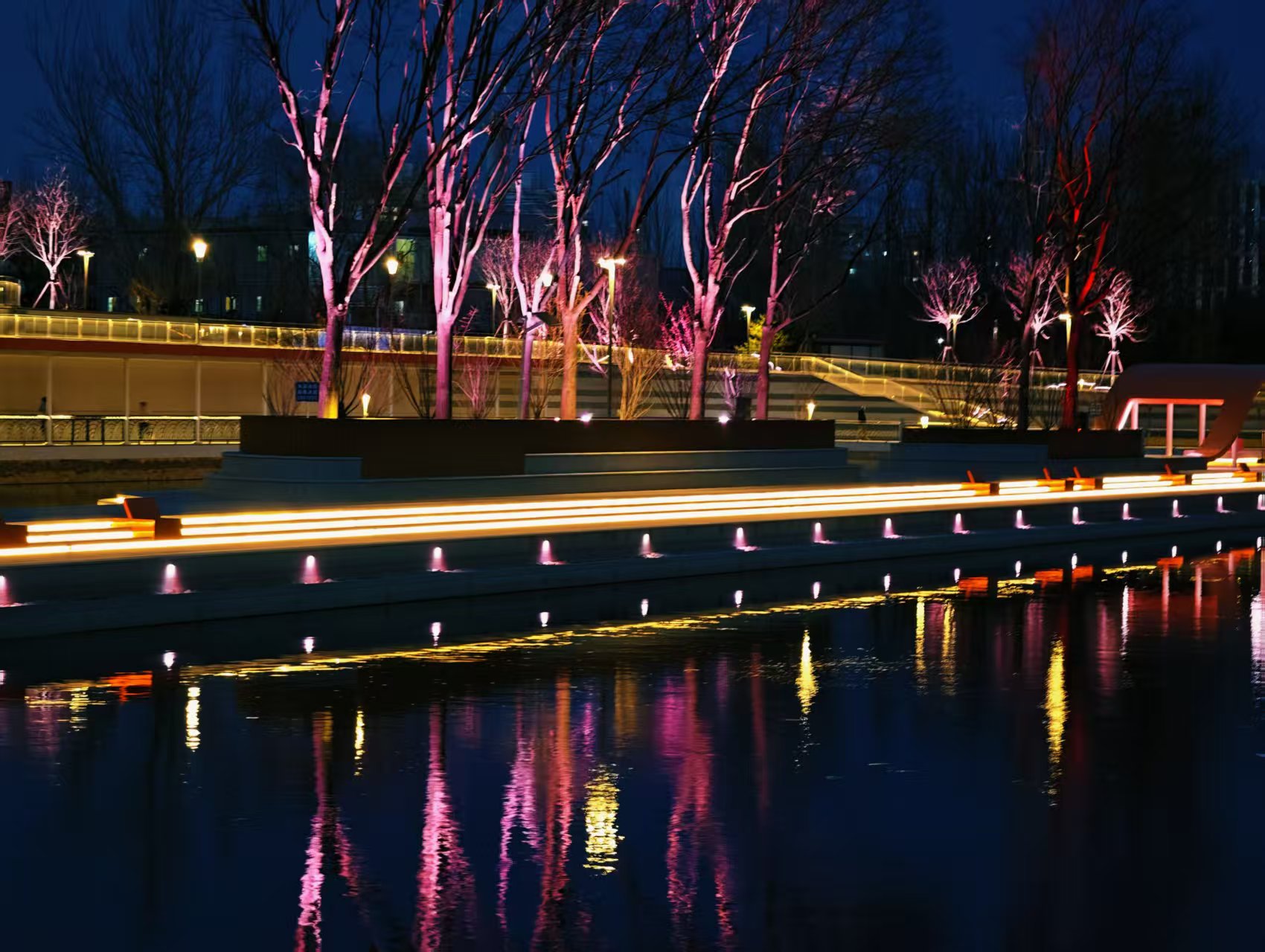 光影迷离,夜色中坝河水畔宛若璀璨星河