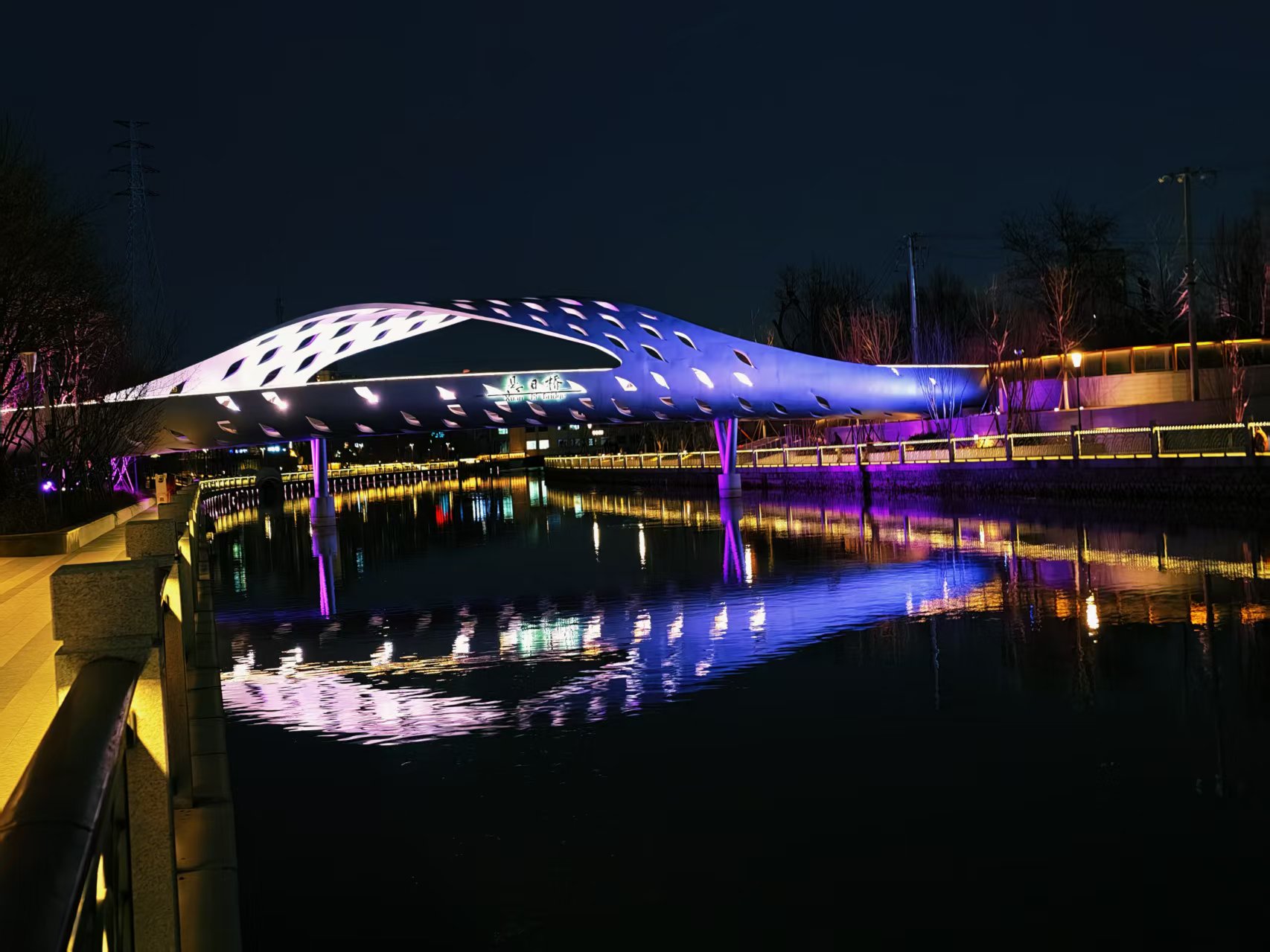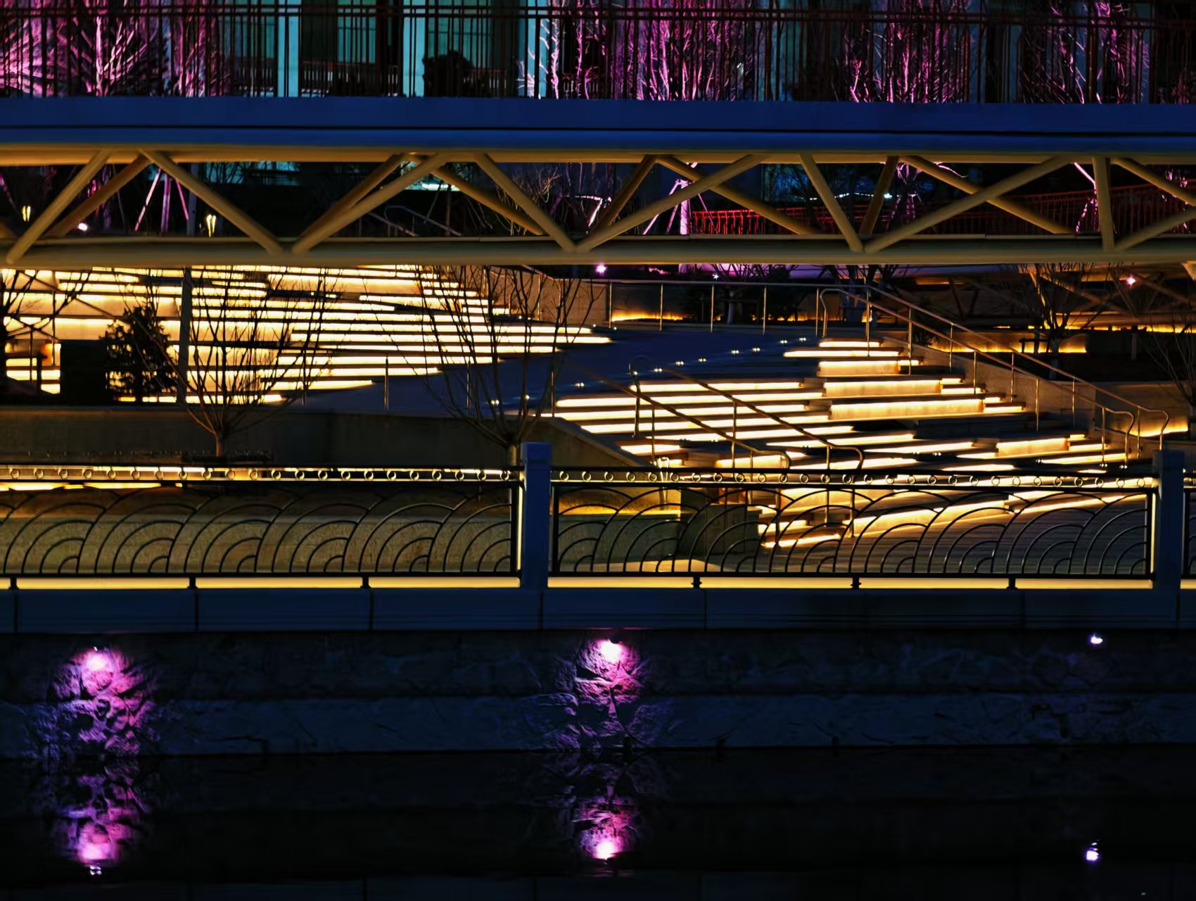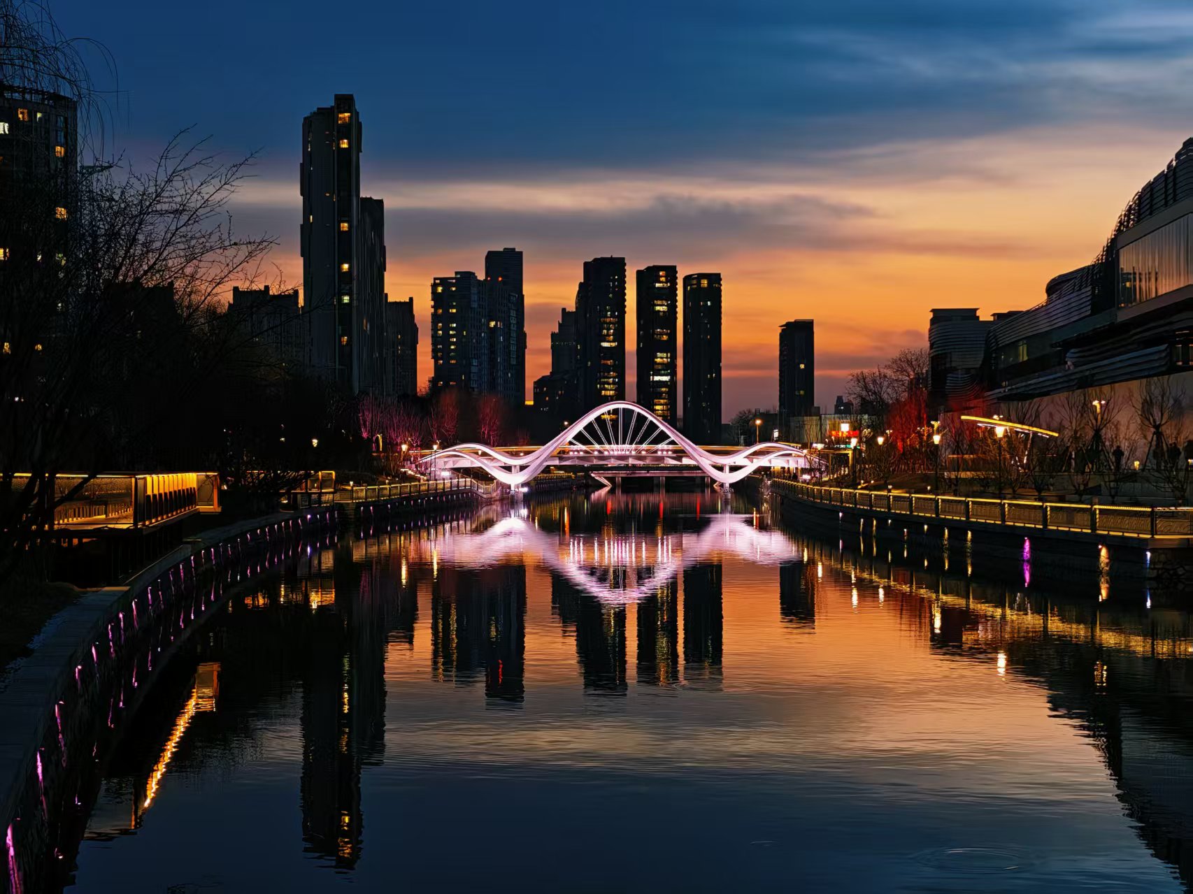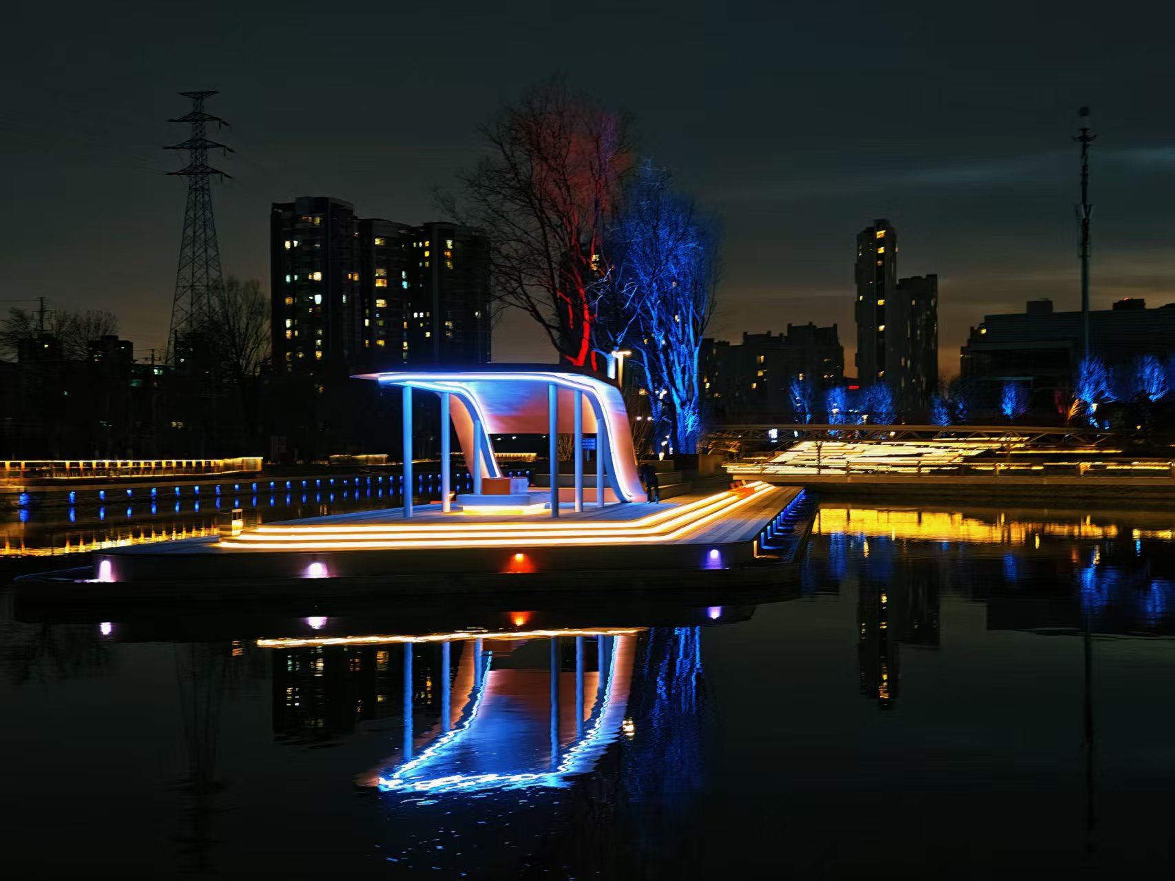 光影迷离,夜色中坝河水畔宛若璀璨星河
