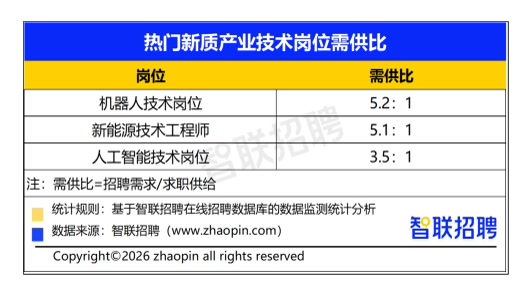 新质产业技术岗位人才缺口显现。智联招聘数据显示,2025年机器人技术岗位需供比达5.2:1,从本体制造到核心零部件研发,从系统集成到调试维护,各环节对技术人才的需求不断,同时掌握各类核心技能的复合型人才仍然稀缺。
