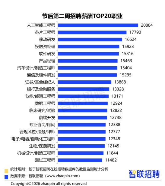 人工智能工程师平均招聘月薪20804元