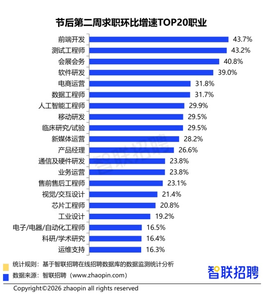 从各职业的求职情况看,前端开发岗位在节后第二周的求职人数环比增速最显著,达到43.7%。与此同时,测试工程师、软件研发、数据工程师、人工智能工程师、临床研究/试验、芯片工程师、电子/电器/自动化工程师等技术密集型岗位的投递活跃度也普遍提升,增速均居于前列。