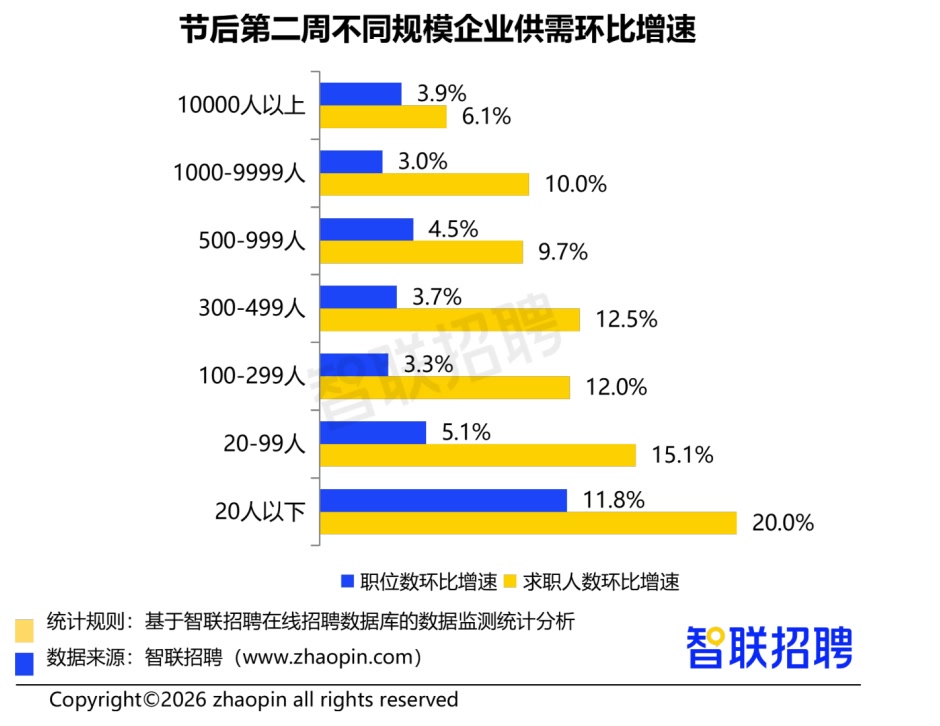从企业规模看,小微企业凭借供需增速双高的亮眼表现,成为撬动市场活力的关键力量。第二周的职位数环比增速上,20人以下的企业环比增长11.8%,增速最快,其次为20-99人的企业,环比增长5.1%;求职人数环比增速上,20人以下和20-99人的小微企业领跑,两者增速分别为20%和15.1%,领先其他规模的企业。