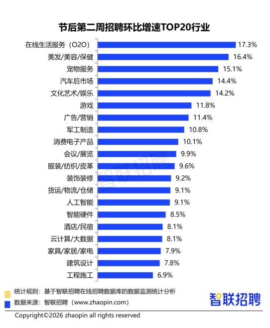 从各行业的招聘情况看,节后第二周,服务消费相关行业占据招聘环比增速榜前列。其中,在线生活服务(O2O)以17.3%的职位数环比增速居行业之首,这与春节后生活服务需求集中释放直接相关。外卖配送、社区团购、即时零售等业态全面复工,平台企业为应对订单激增,快速扩充运力与运营团队。
