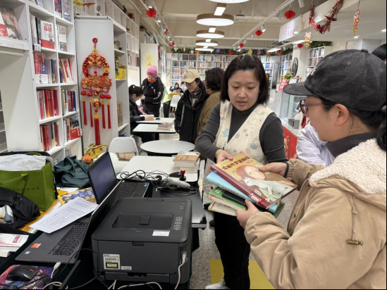 随后,一场特别的“幕后接力”悄然展开。 当读者们移步阅读区静心聆听讲座时,图书馆工作人员则争分夺秒,开启了一段无声的忙碌:现场采购、分类编目、快速入藏,并将加工完成的图书第一时间为读者办理借阅手续,逐一录入一卡通中。整个下午,书香在台前流淌,书页在幕后流转,两场“盛宴”同步进行,动静相宜,互不打扰,却同样丰盈。