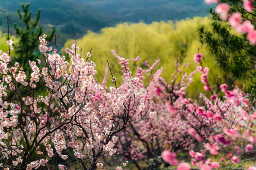 漫山粉白桃花缀满遒劲枝桠,层层叠叠铺满山野,与连绵青山相映成画。漫步花间寻香,登高俯瞰粉色山谷,邂逅这份春寒里的蓬勃生机。
