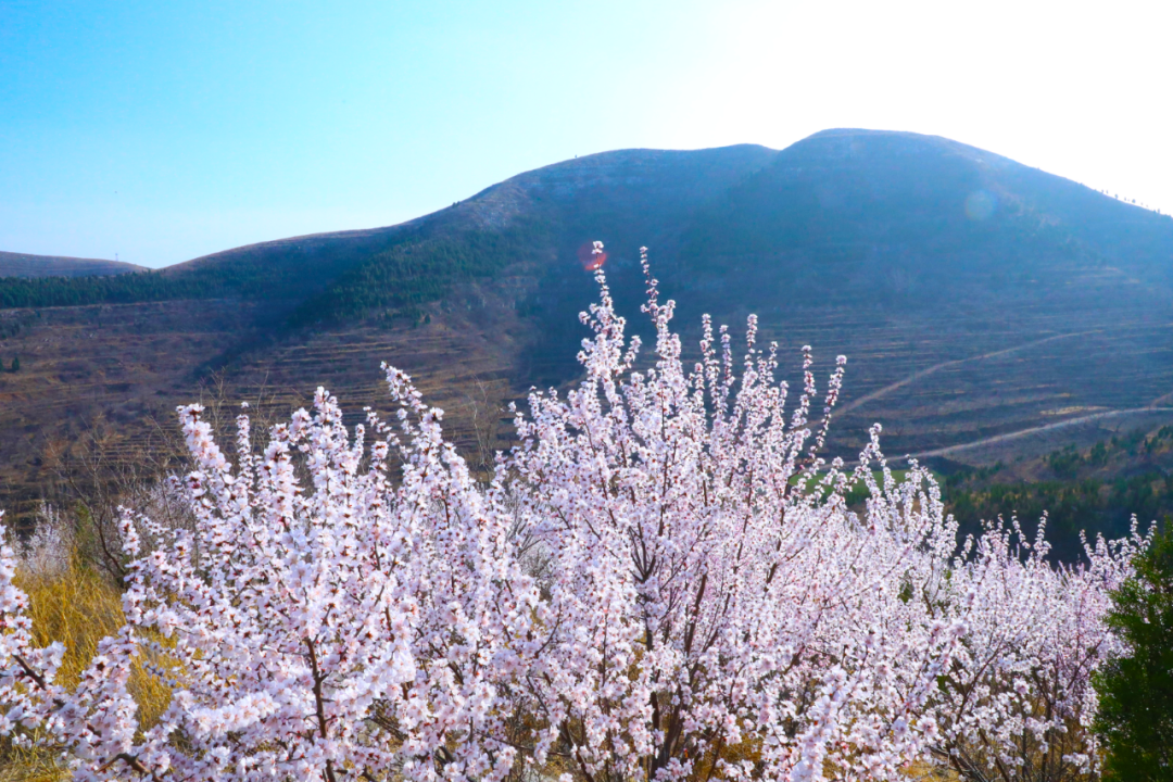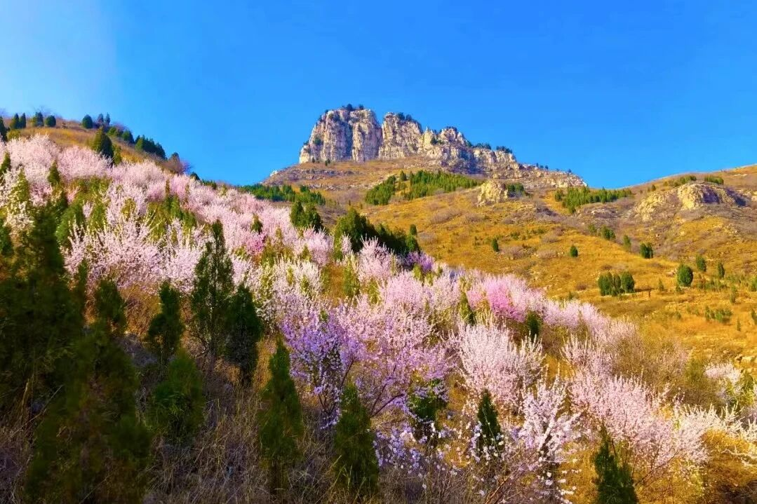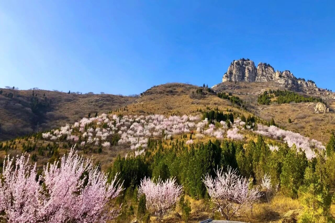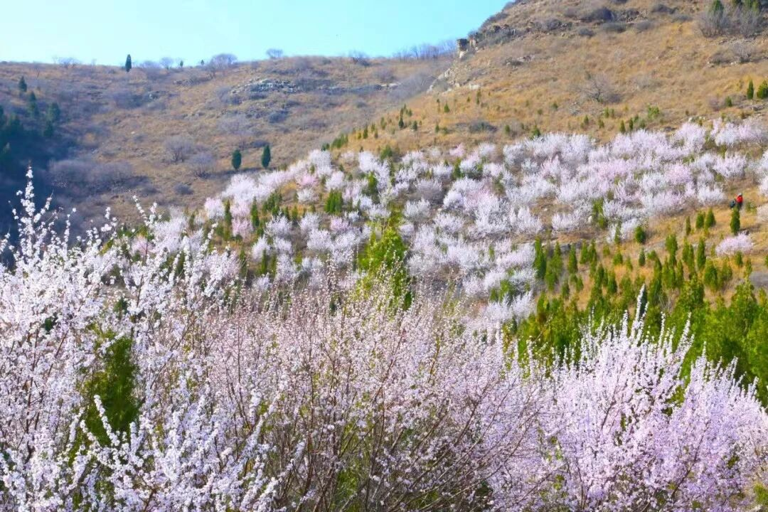 三面环山的独特凹地暖湿小气候,孕育了数千株野生山桃,每年三月上旬便迎来盛放期。