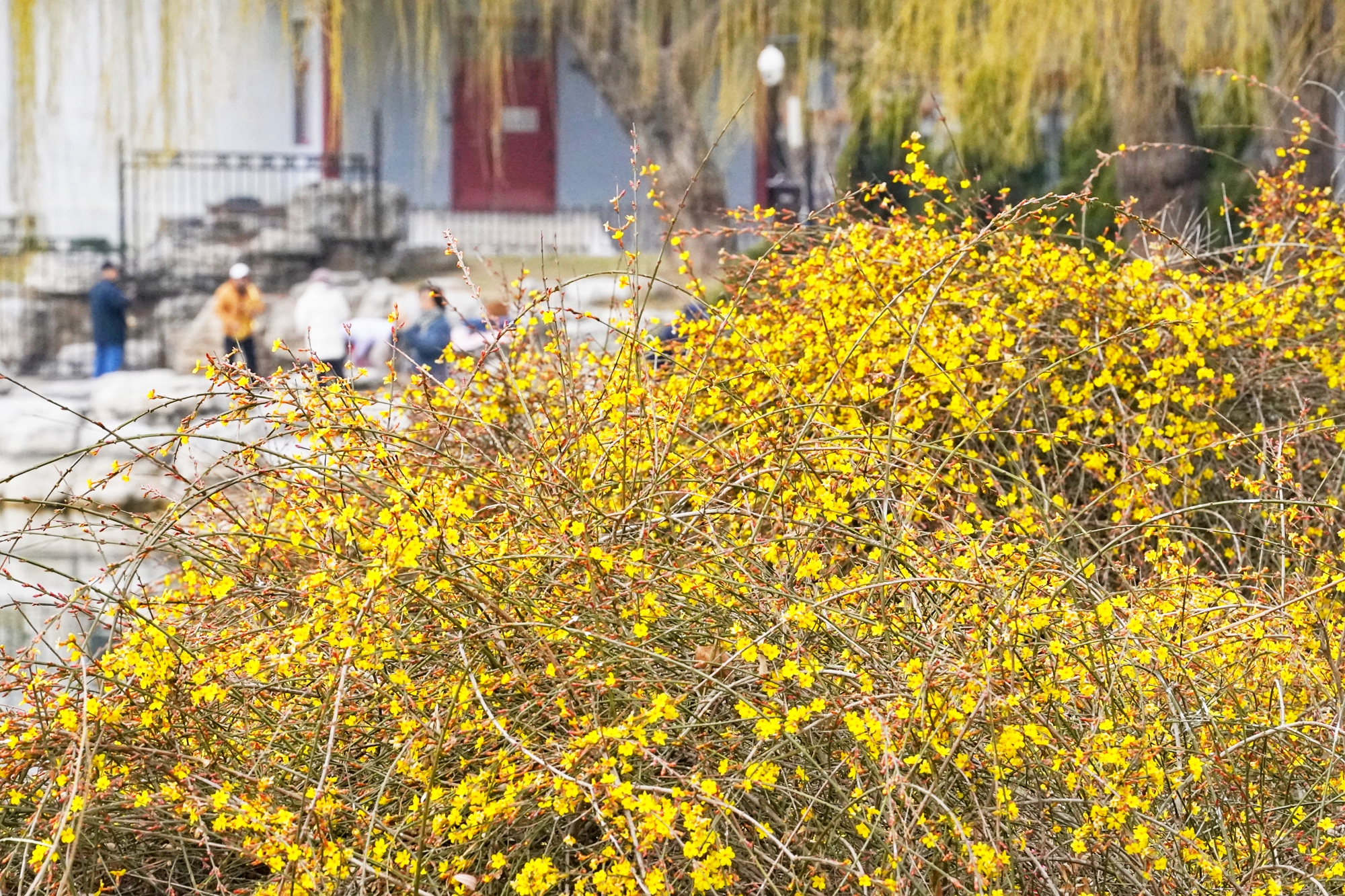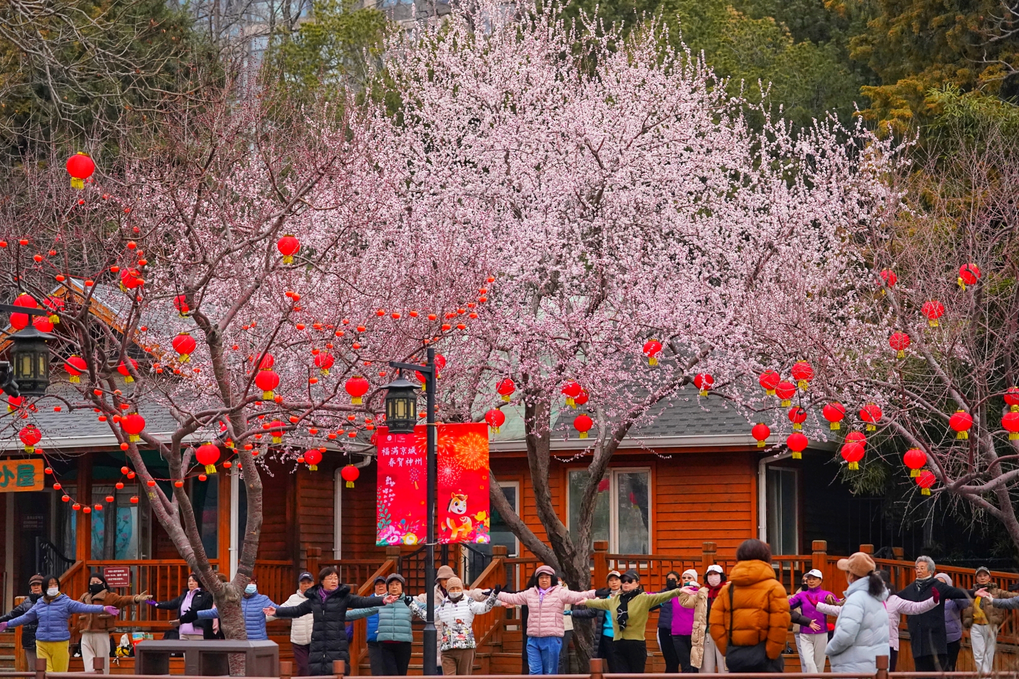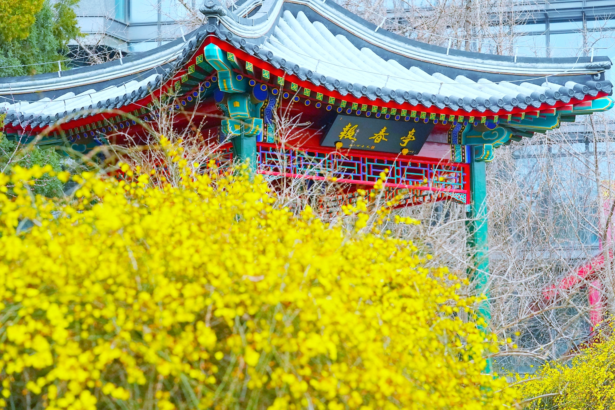 随着气温回暖,陶然亭公园迎来春景。迎春花缀满枝蔓,金黄花海铺就步道,柳丝抽出浅绿,随风拂过湖面,山桃花初绽芳容,粉花配红灯笼,年味未散春意更浓。