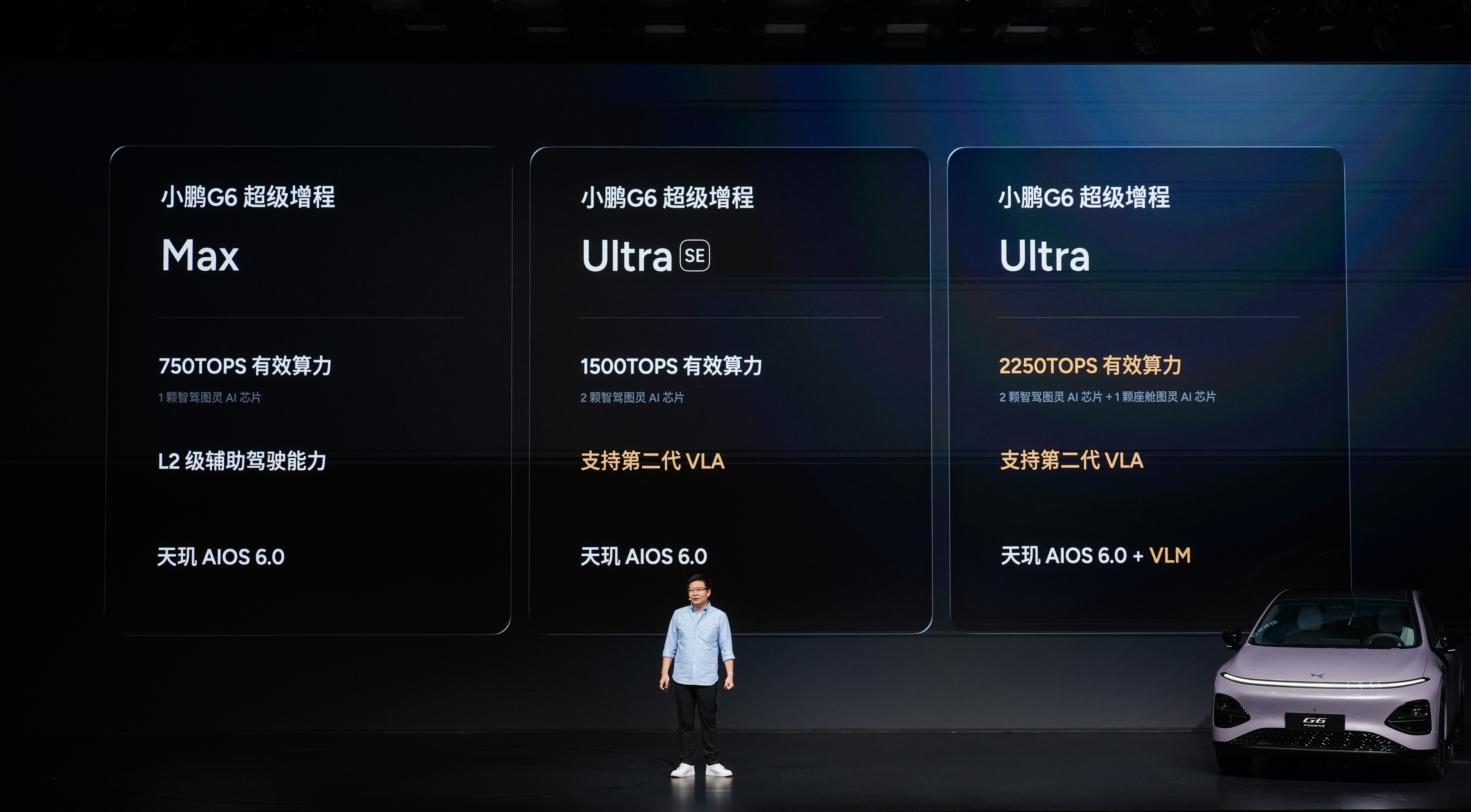 G6超级增程的上市,首次将第二代VLA带入了小鹏汽车旗下20万元以内车型,整车算力最高达2250TOPS,为高阶智能辅助驾驶提供超强算力支撑,其中Max标配1颗图灵AI芯片,Ultra SE搭载2颗图灵AI芯片,Ultra搭载3颗图灵AI芯片,不同版本的算力配置均能适配全场景需求,为用户打造丝滑的智能出行体验。据了解,Ultra、Ultra SE版本将于4月份开启第二代VLA全量推送,Max版也将于今年下半年推送蒸馏后的版本。