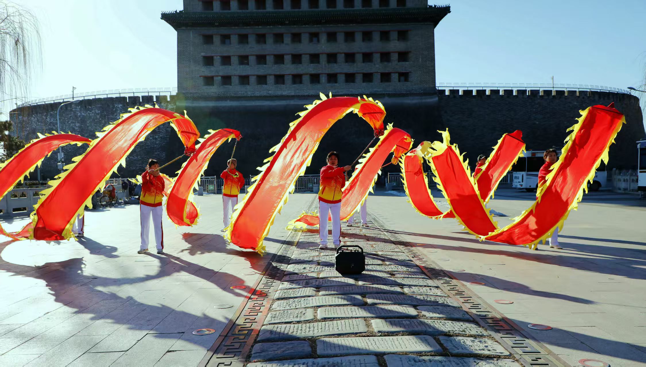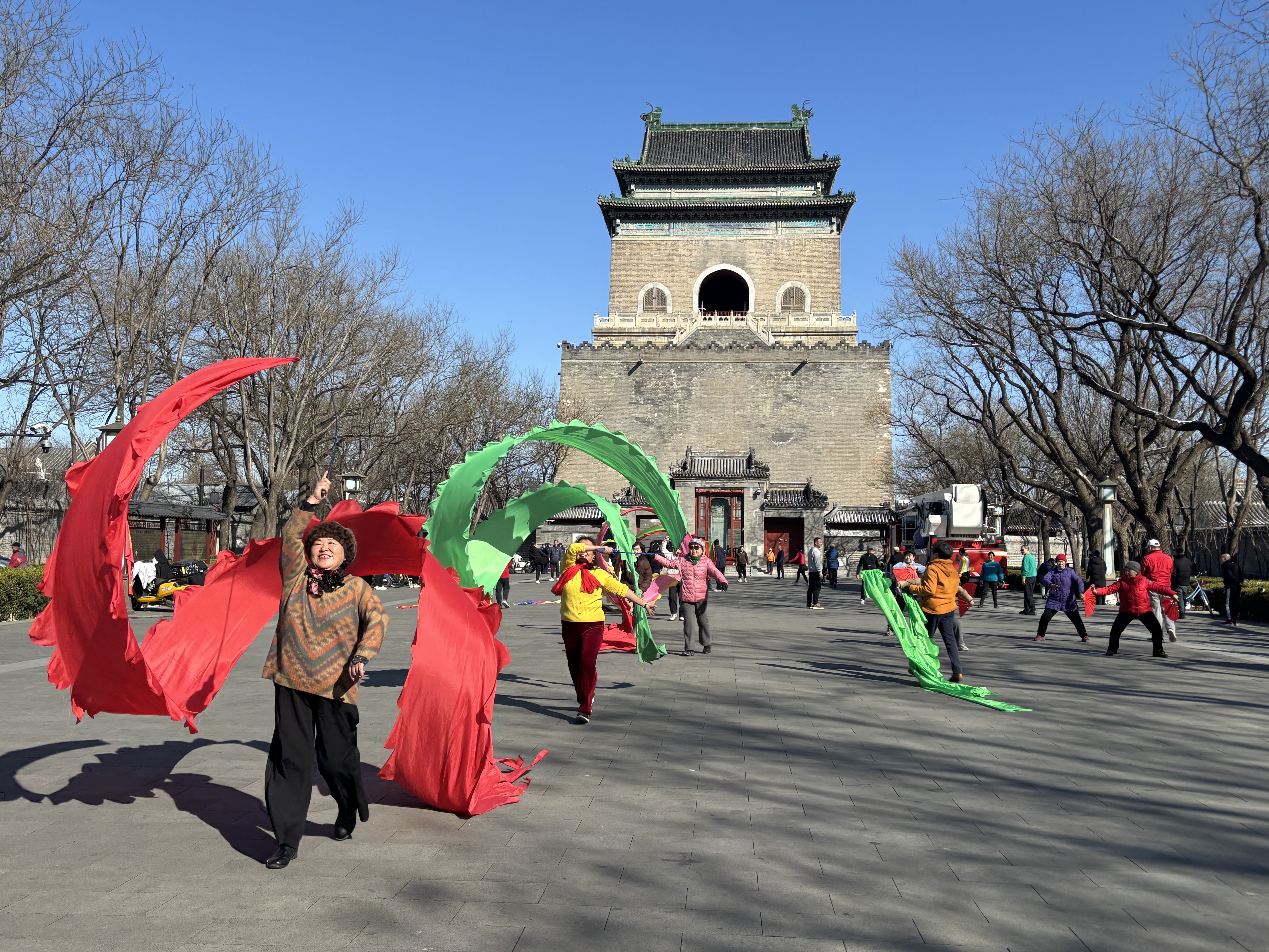 早上9点多,钟鼓楼广场上,十余条色彩斑斓的彩绸在空中翻飞。“左、右,飞、龙、在、天……”今年68岁的西城彩绸舞龙队队长王娅丽动作利落,满脸笑意,她带领大家边说边舞,只见一条条“长龙”随着欢快的音乐节奏腾跃而起。
